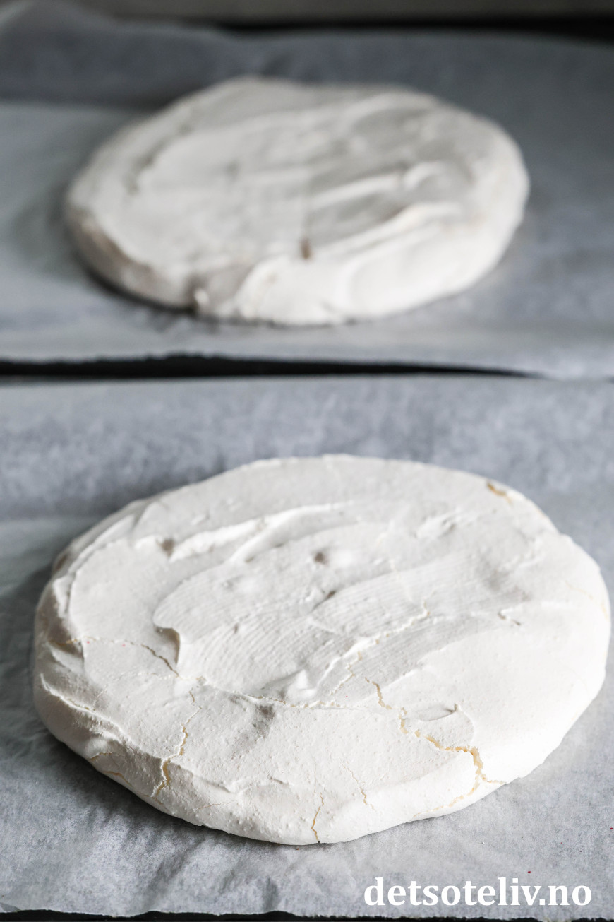 ♥ Det går fint å steke marengsbunnene samtidig dersom du har varmluftsovn. Pass på å bytte plassering i ovnen etter at halve steketiden har gått, slik at bunnene blir like mye stekt.