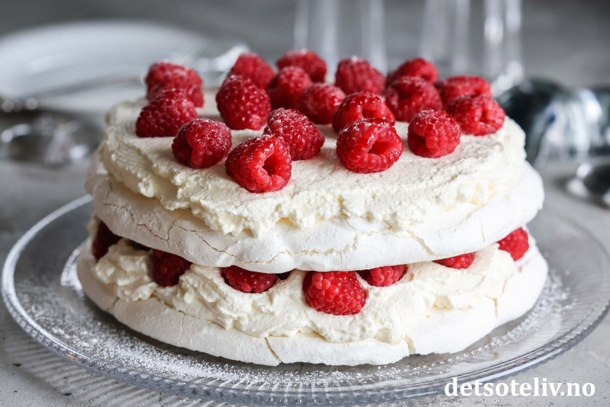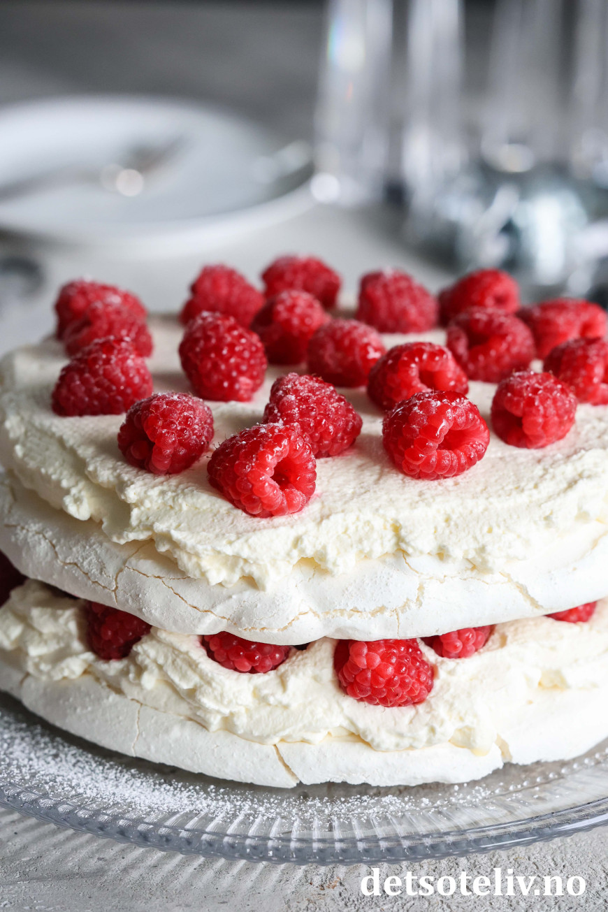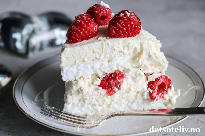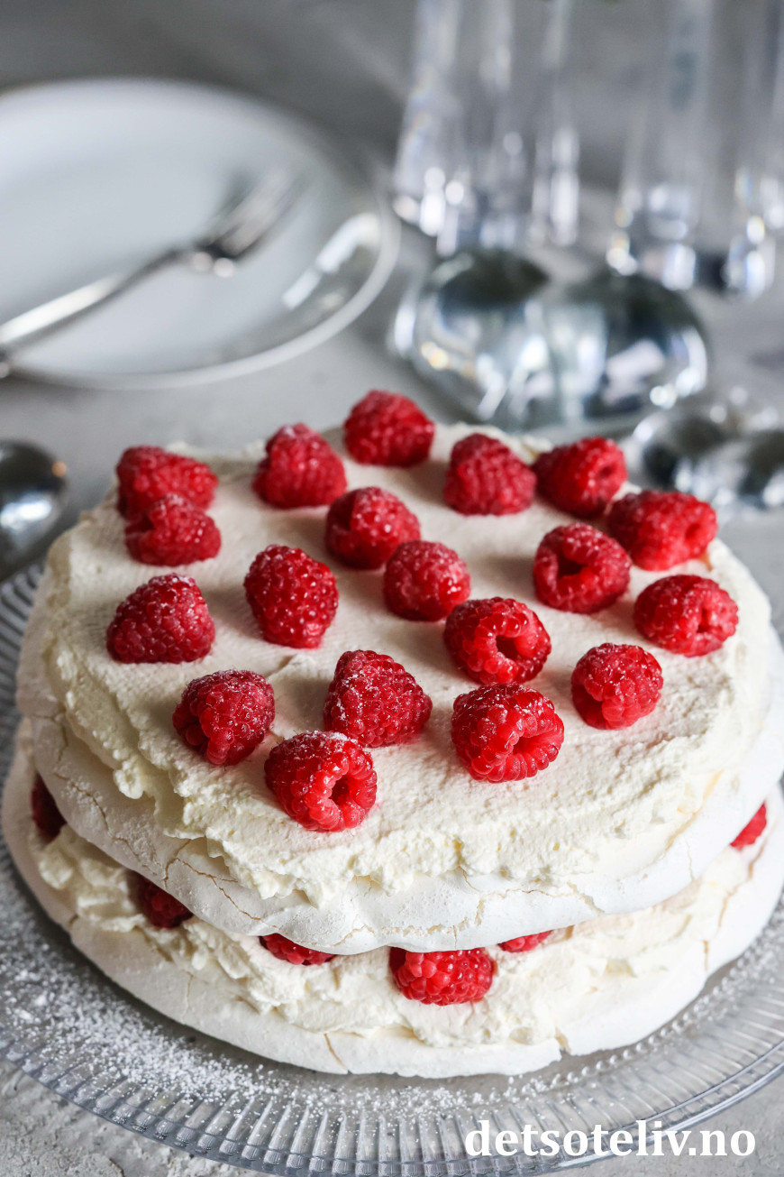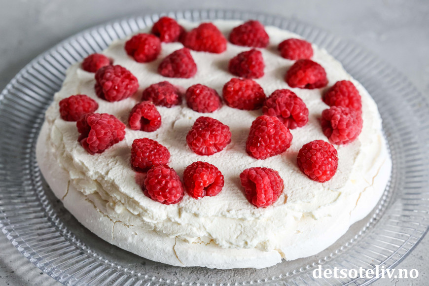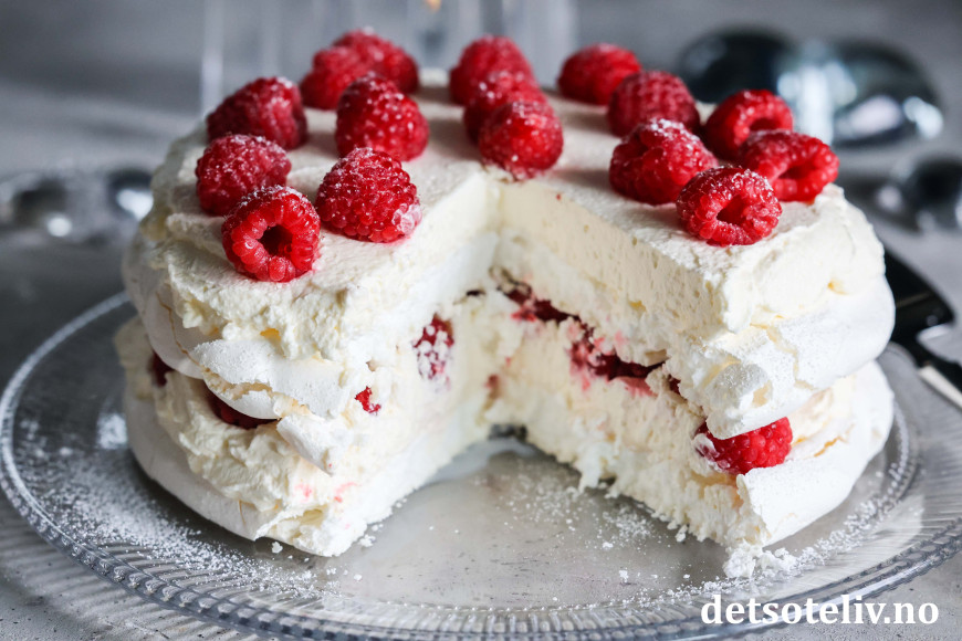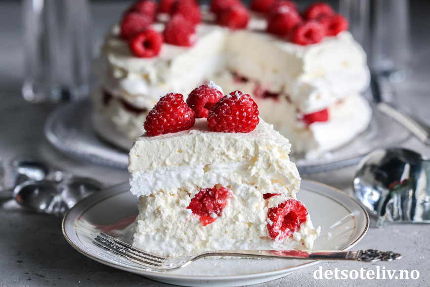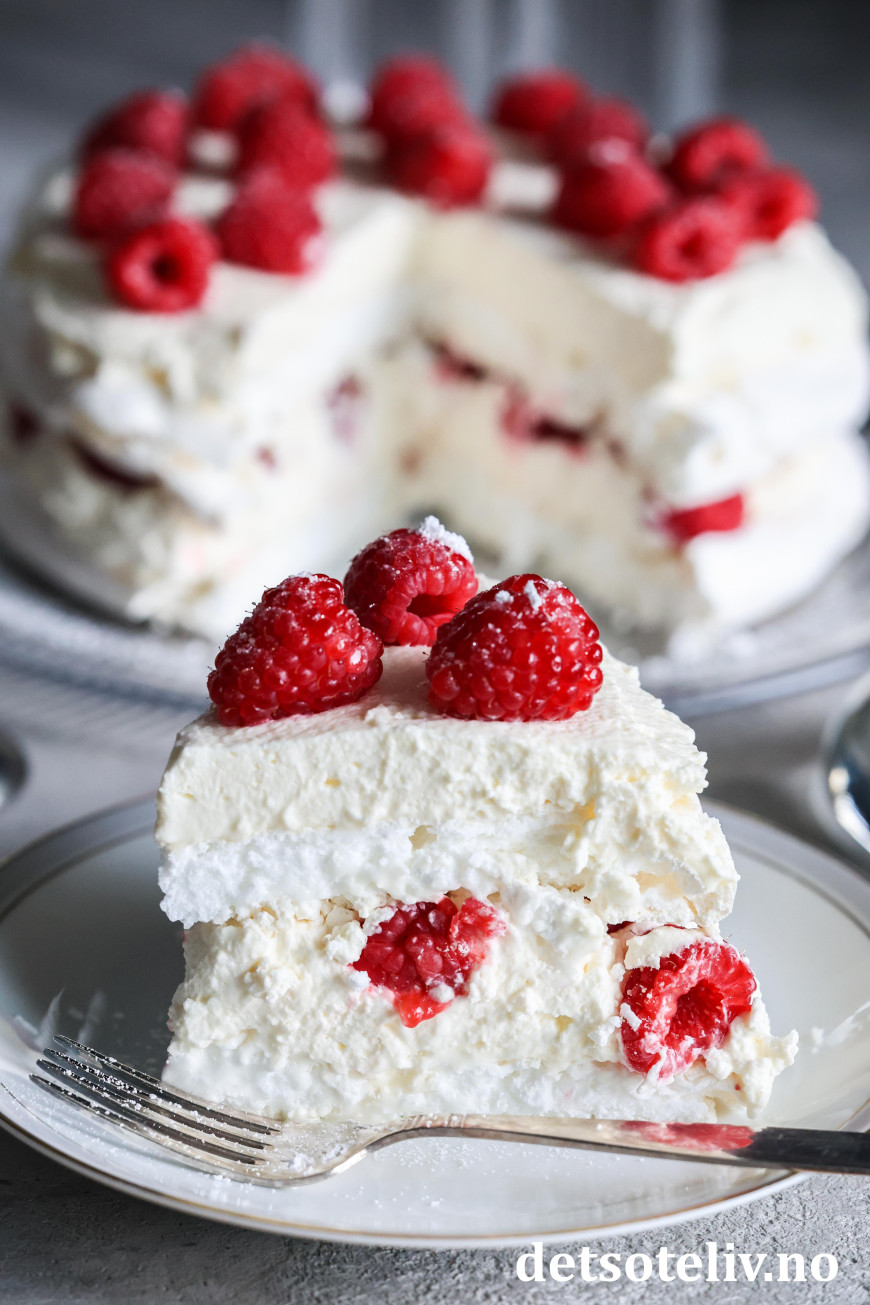 Nydelig kake bestående av to marengsbunner, pisket krem med vaniljesmak og bringebær!