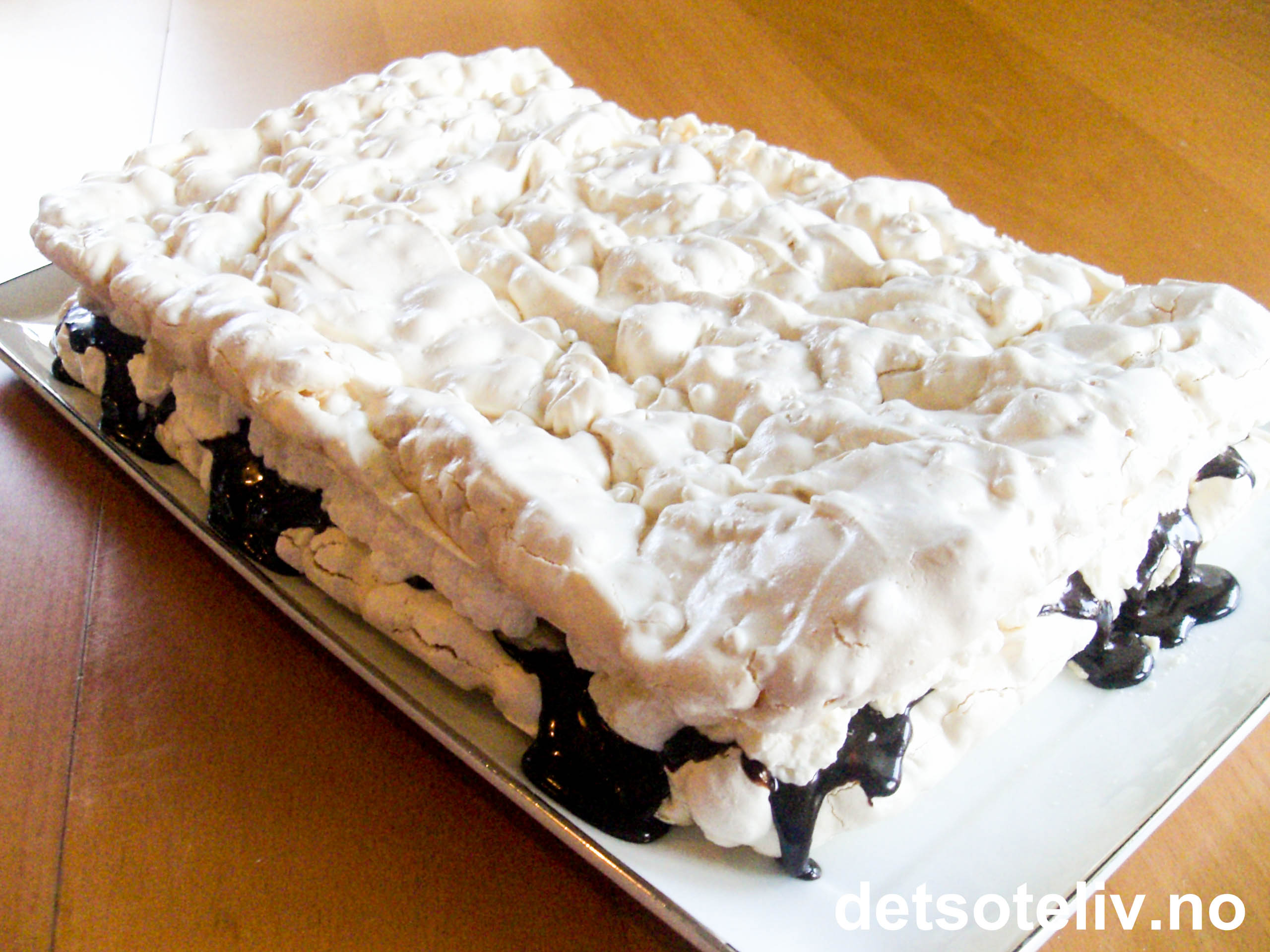Her har du en vidundelig god og alltid populær marengskake! Marengsen inneholder puffet ris! Mellom marengsbunnene finner du et deilig fyll av pisket krem, en helt spesielt god hjemmelaget sjokoladesaus og bananskiver.