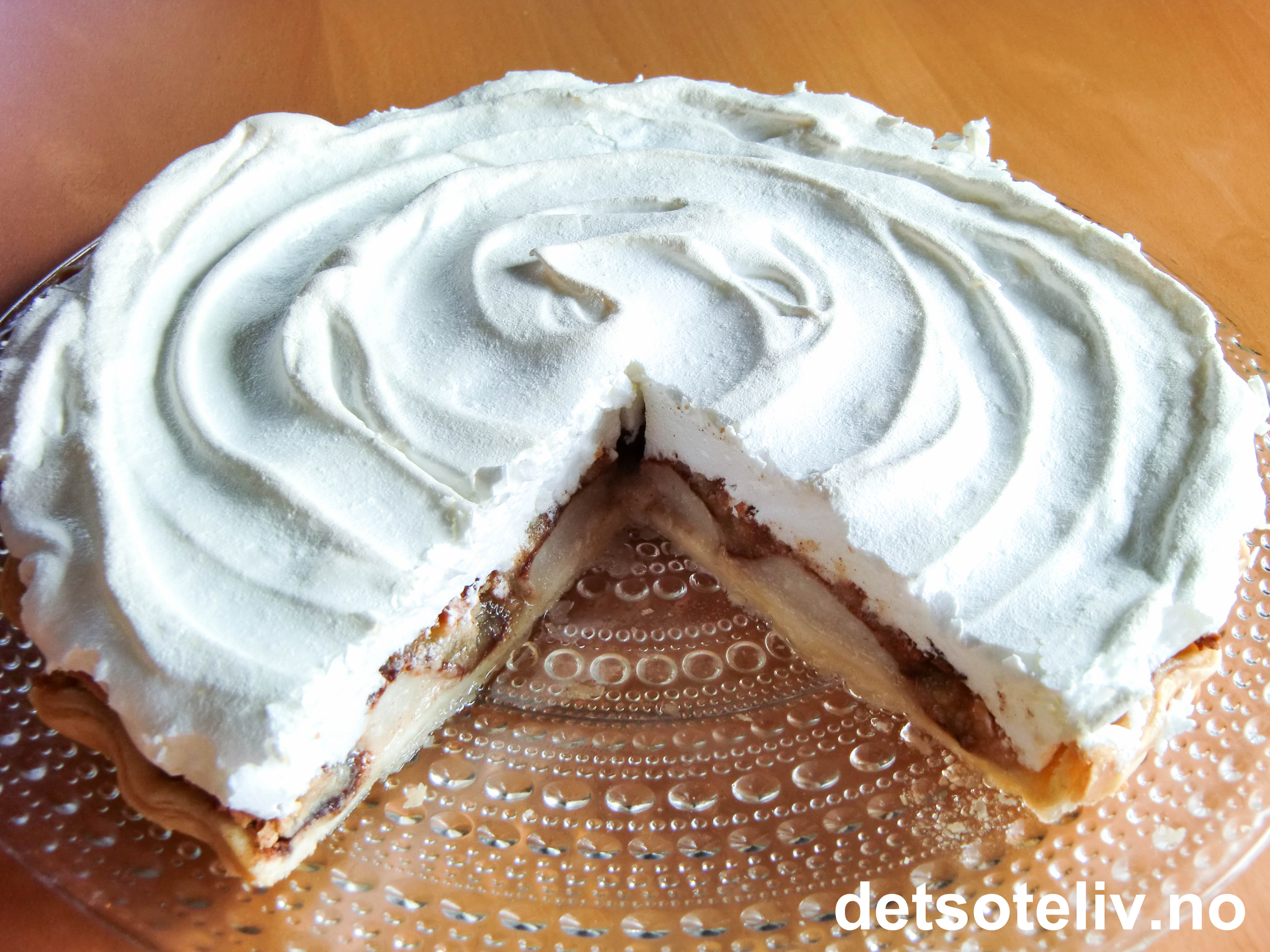 Ta kaken ut av ovnen og senk temperaturen til 175°C. Sprøyt eller fordel marengsen over pærene. Stek paien ytterligere ved 175°C midt i ovnen i ca 10 min, til marengsen har fått lys farge.