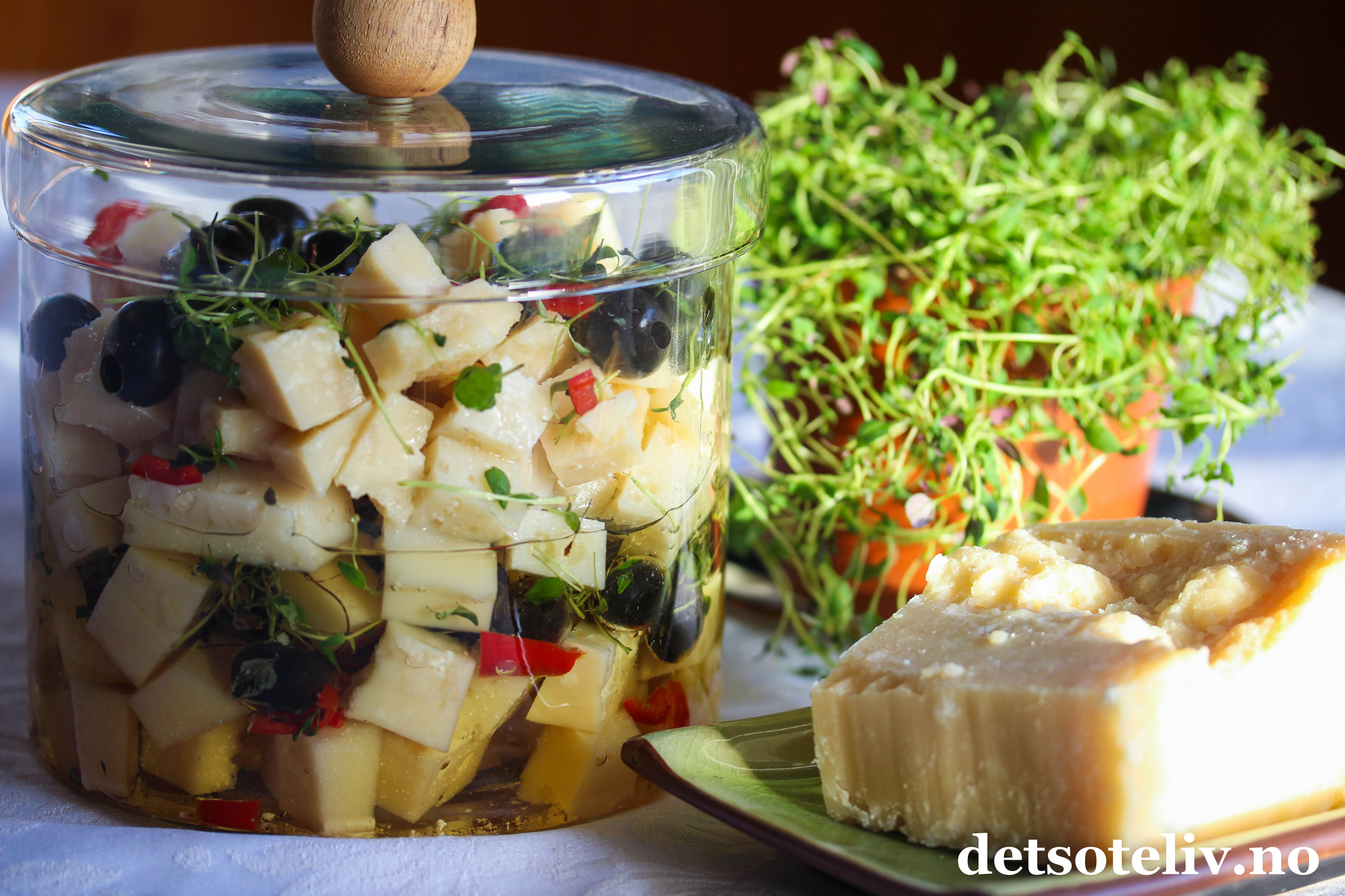 Marinert ost er lett å lage, og kjekt å servere enten det er som tilbehør til koldtbord, sammen med kjeks, i en salat eller bare for å sitte og småspise i lag. Et glass med marinert ost er også godt egnet som velsmakende gave.