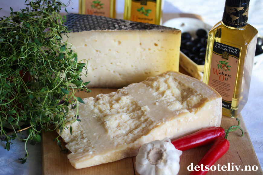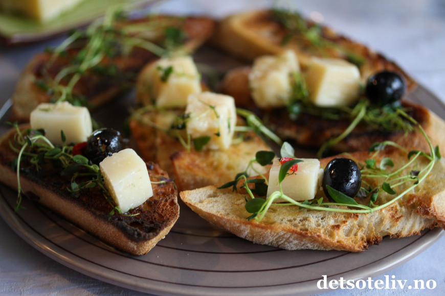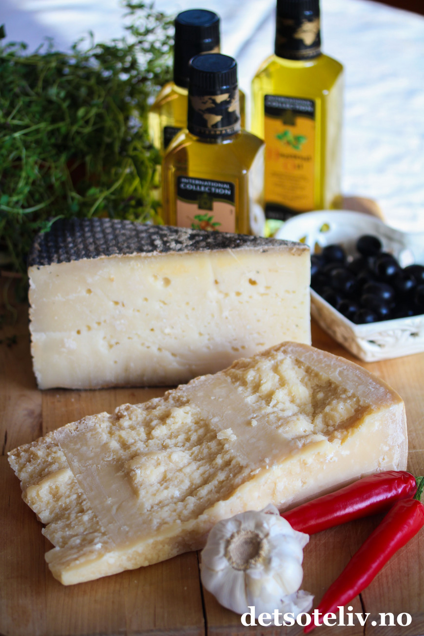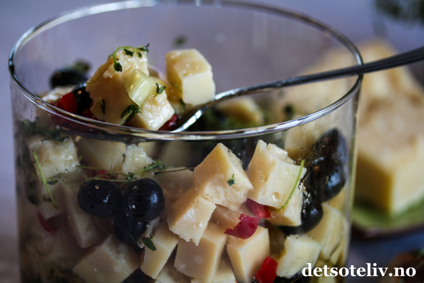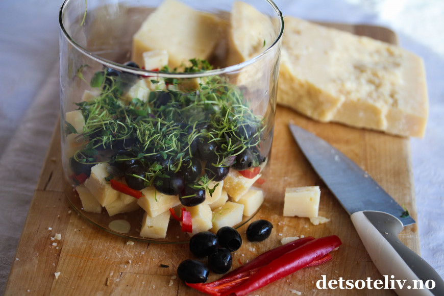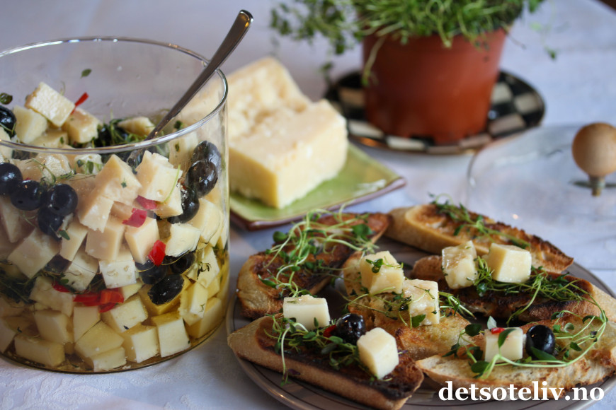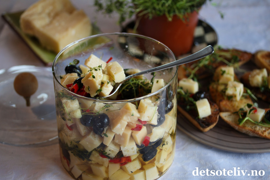 Marinert parmesan med oliven, urter, hvitløk, chili og valnøttolje.