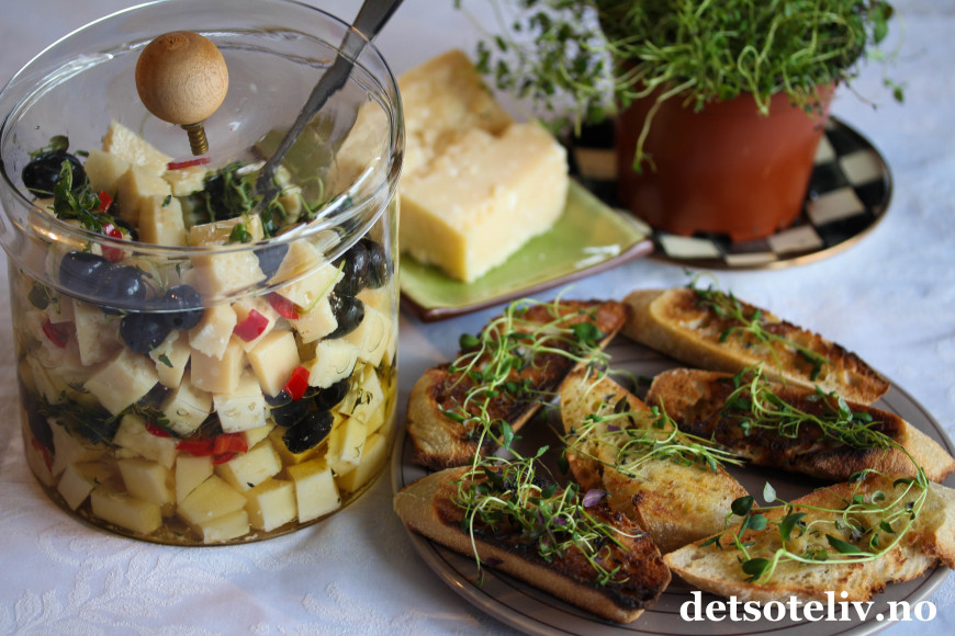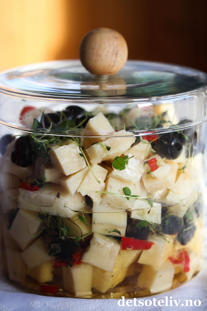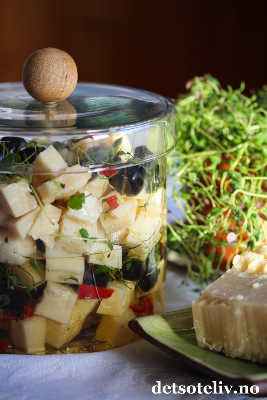 ♥ Marinert ost har lang holdbarhet i kjøleskapet. Rør litt rundt i den av og til, slik at alle ostebitene blir trukket inn av oljemarinaden.