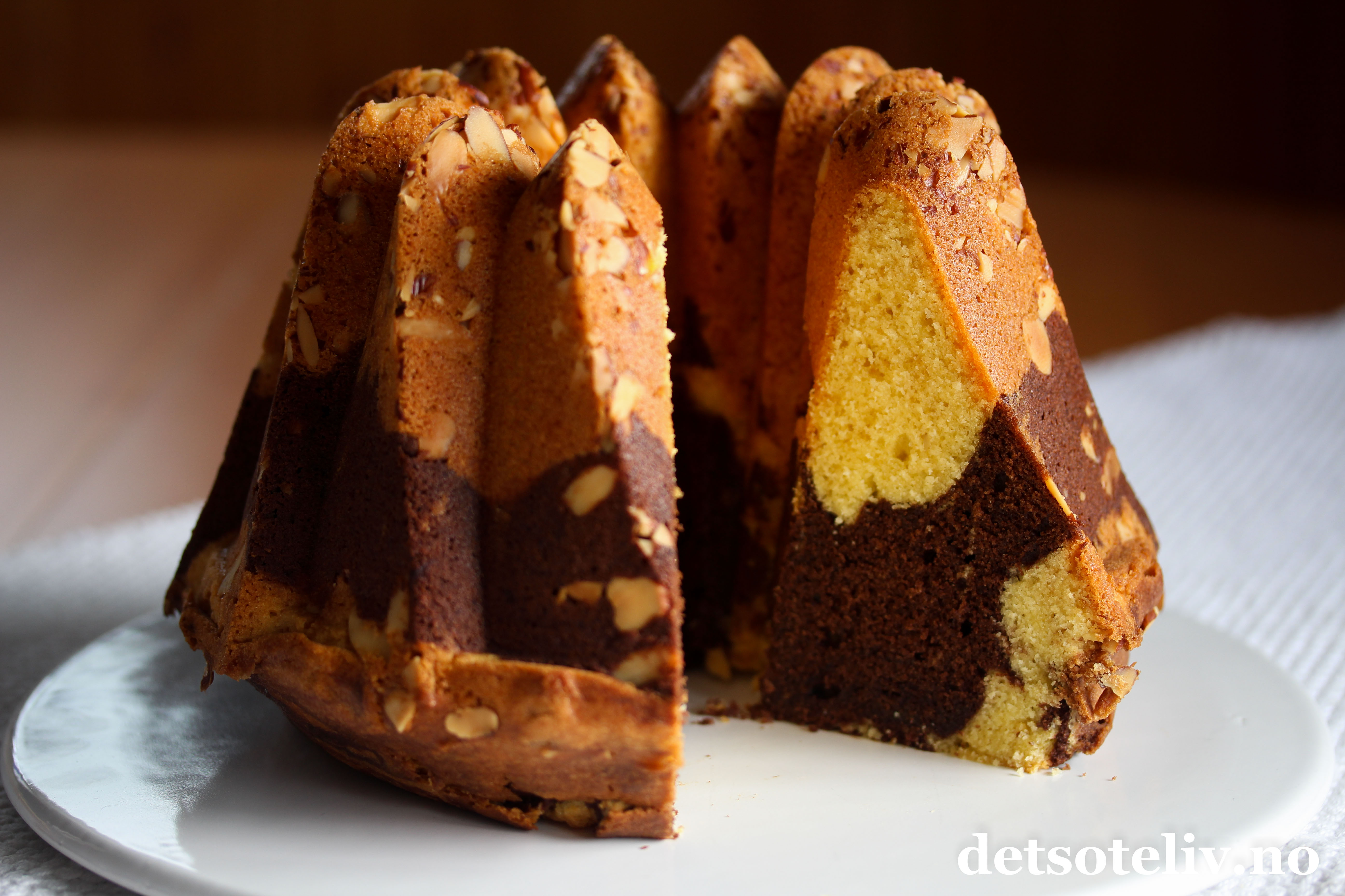 ♥ Vil du ha en mer standard smak på marmorkaken er det bare å droppe kaffen. Det er heller ikke noe problem å droppe mandelflakene i formen hvis du vil ha en nøttefri kake.