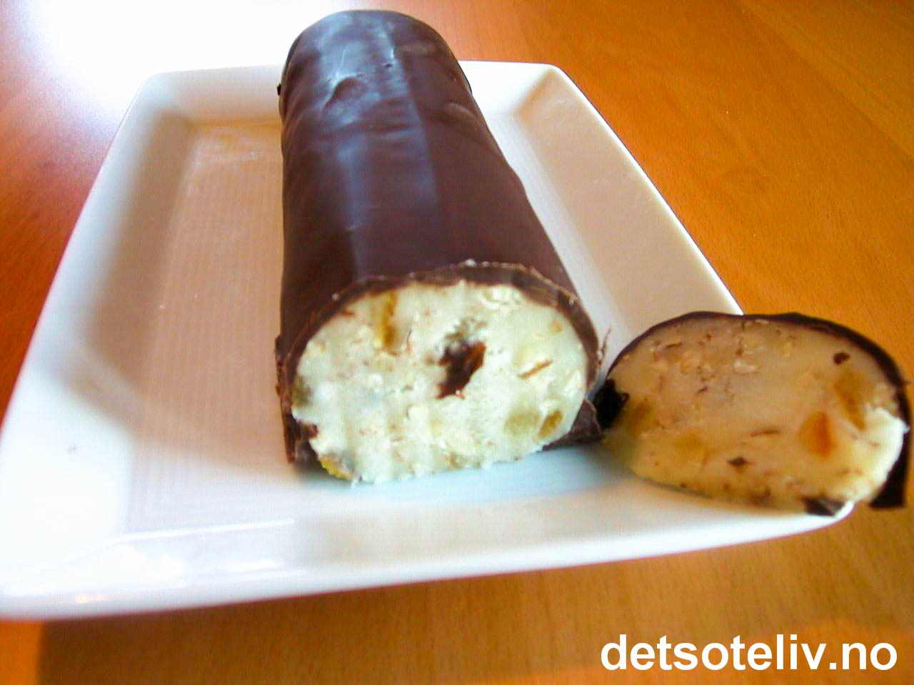 Smelt kokesjokoladen sammen med delfiafett. Avkjøl litt. Smør sjokoladen over marsipanbrødet med en smørekniv. Start med å smøre sjokolade på undersiden av marsipanbrødet. Sett i kjøleskapet (eller fryser) til sjokoladen har stivnet. Snu brødet og smør resten av sjokoladen på oversiden av marsipanbrødet. La stå i kjøleskapet til sjokoladen har stivnet.