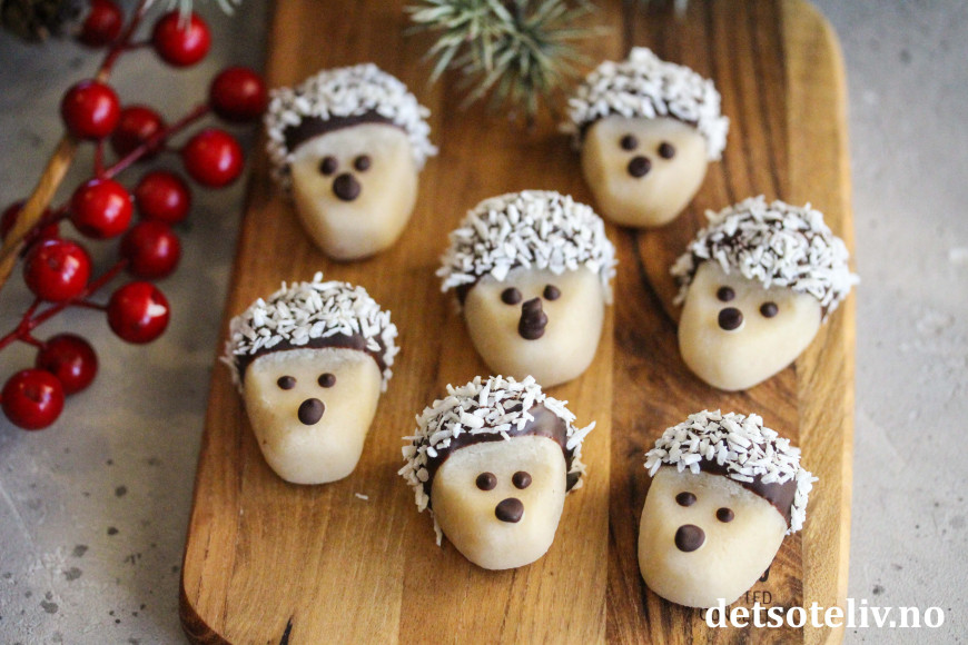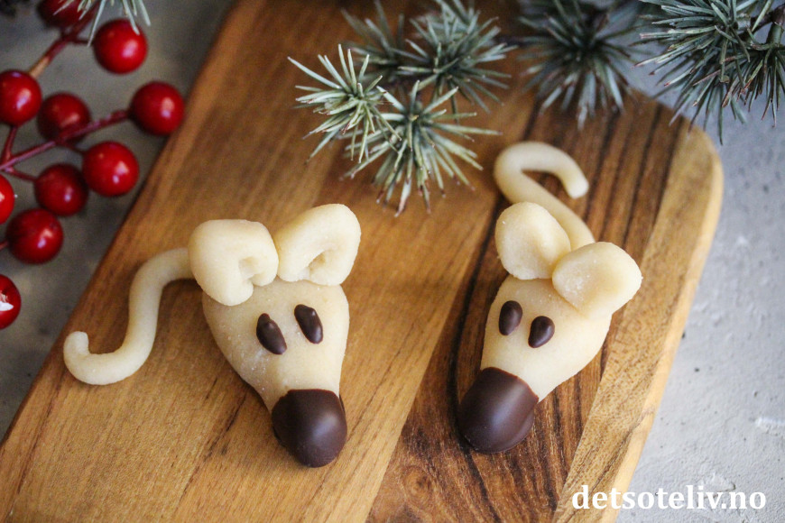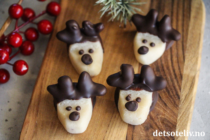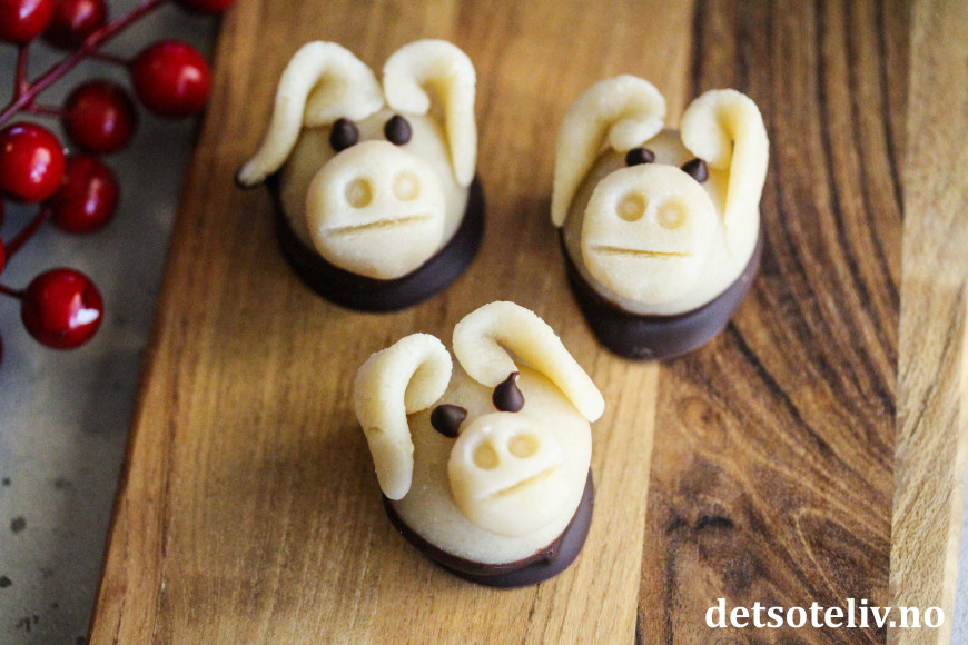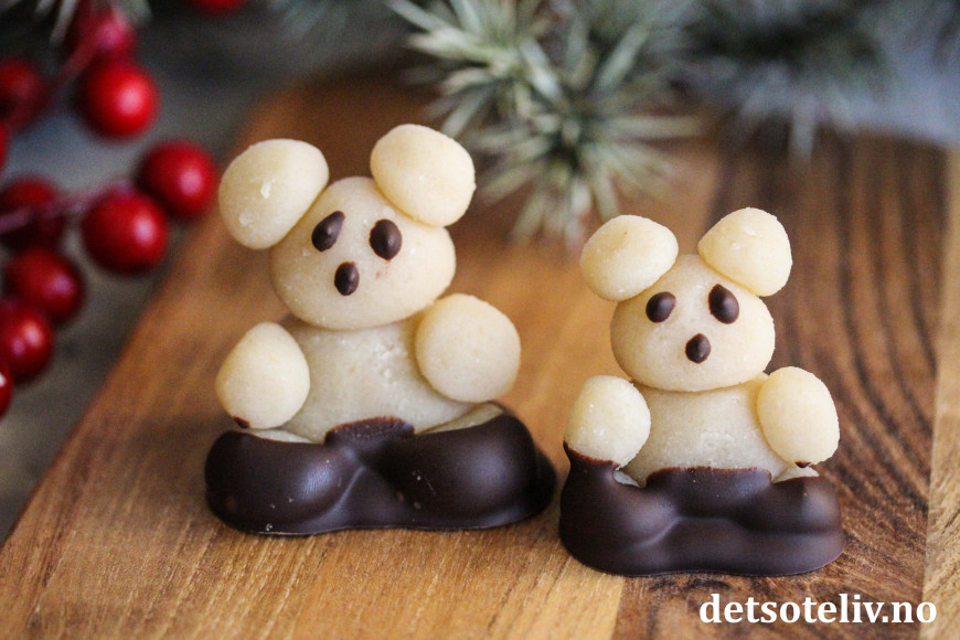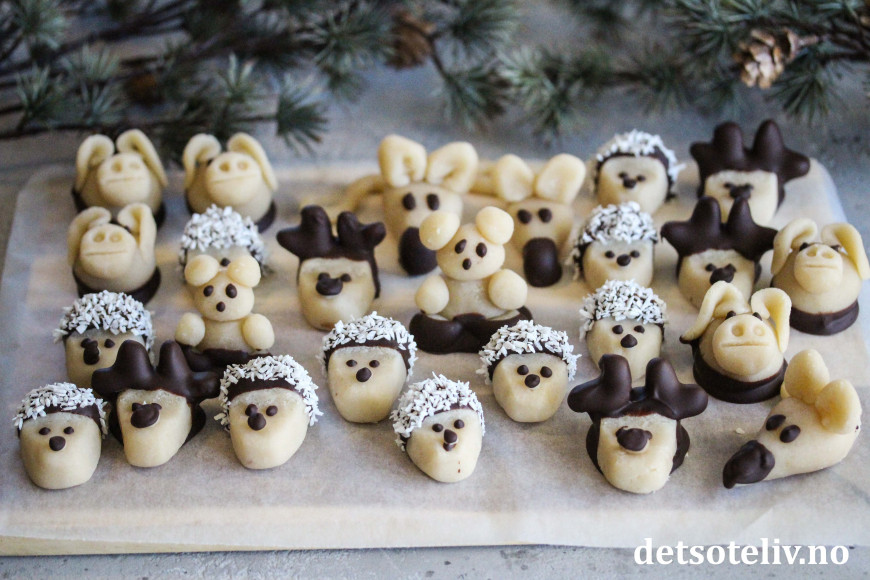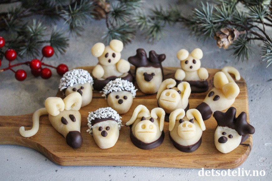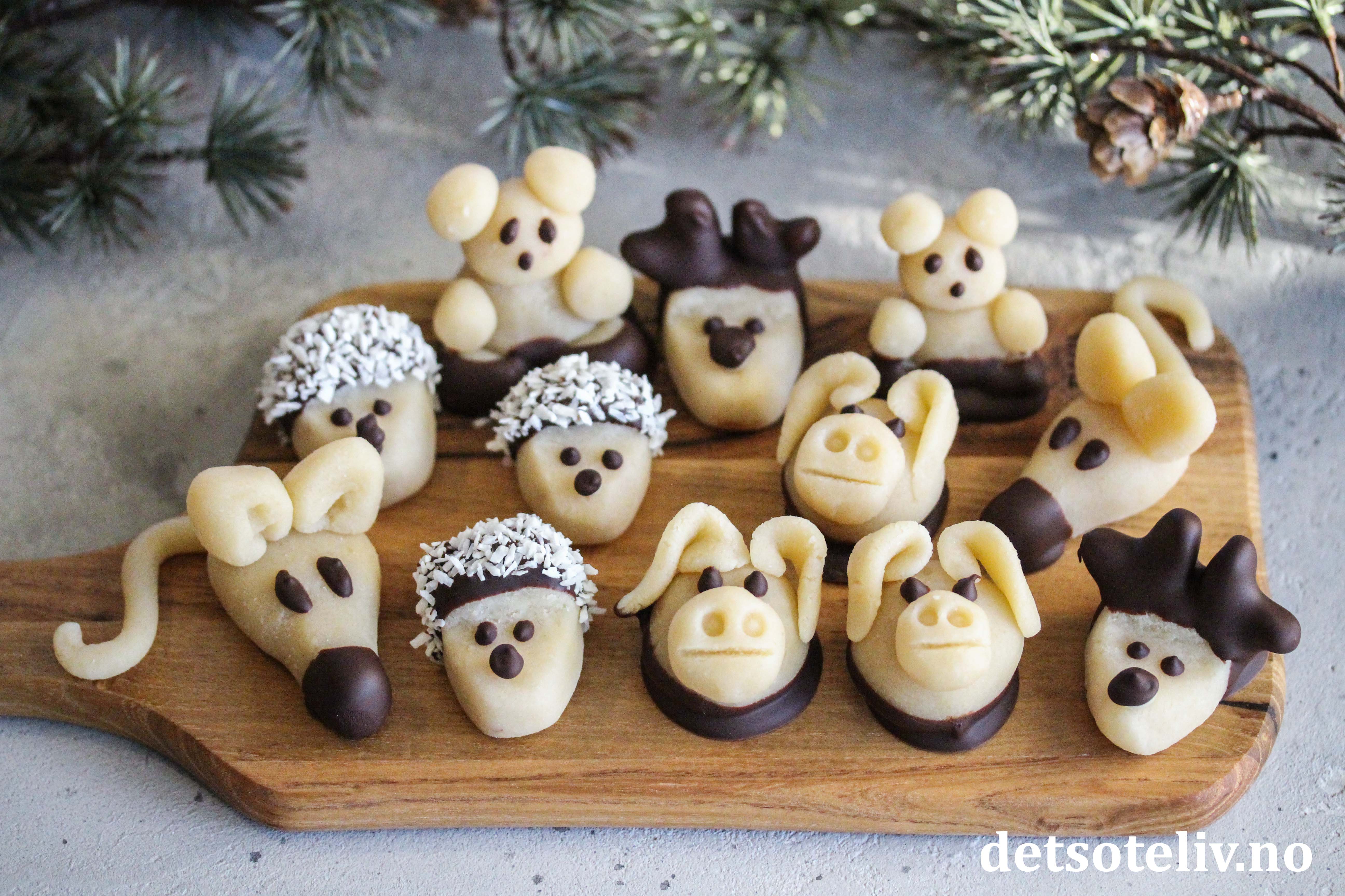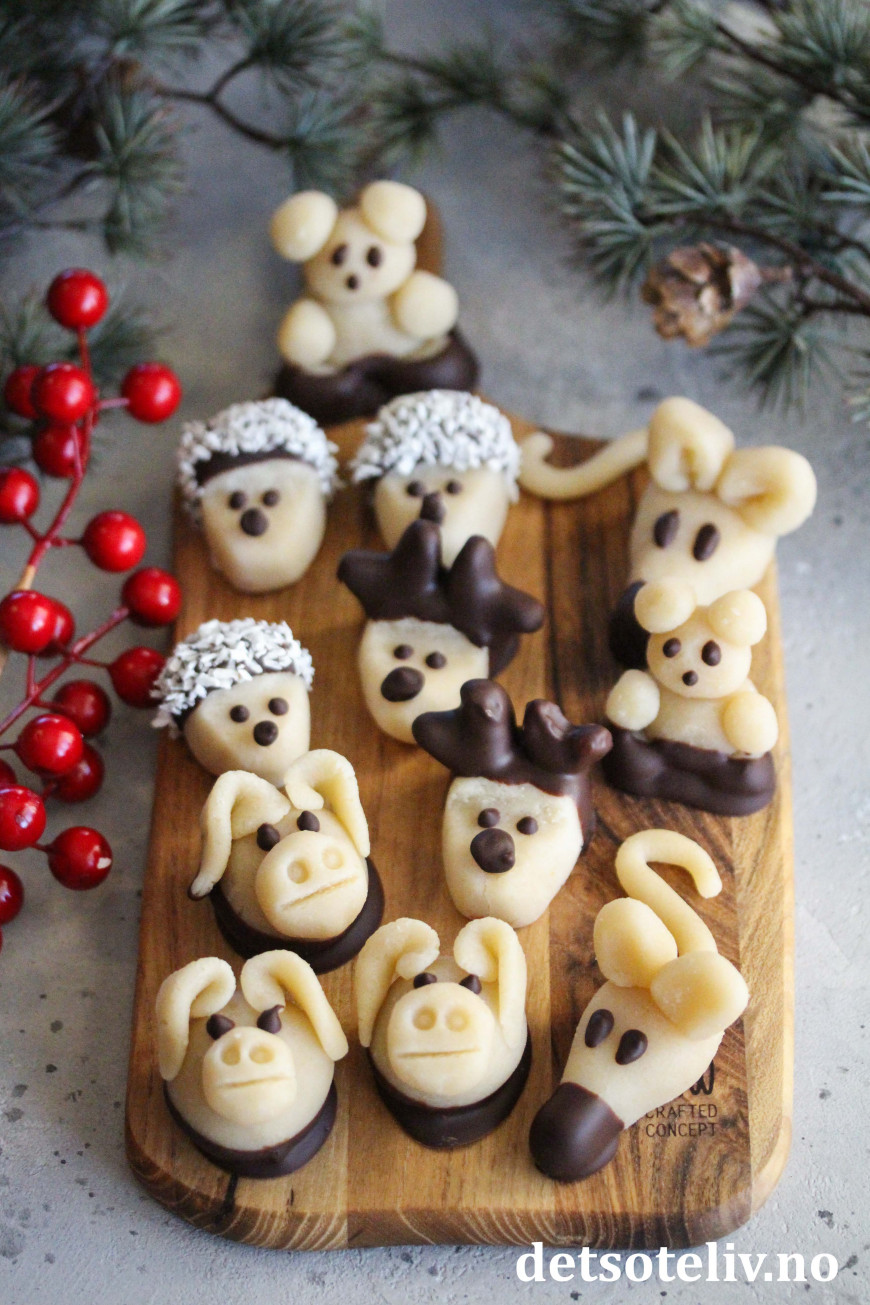 Er artig juleaktivitet å gjøre med barna er å forme søte marsipanfigurer og dyppe dem i sjokolade.
