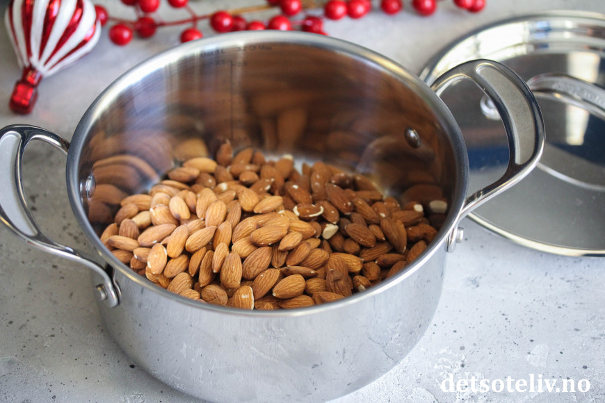 Skåld mandlene ved å ha dem i en kjele med kokende vann.