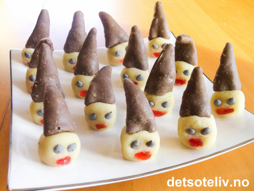 Kna konjakk inn i marsipanen hvis du ønsker litt alkoholsmak på nissene dine. Trill kuler til ansiktene.