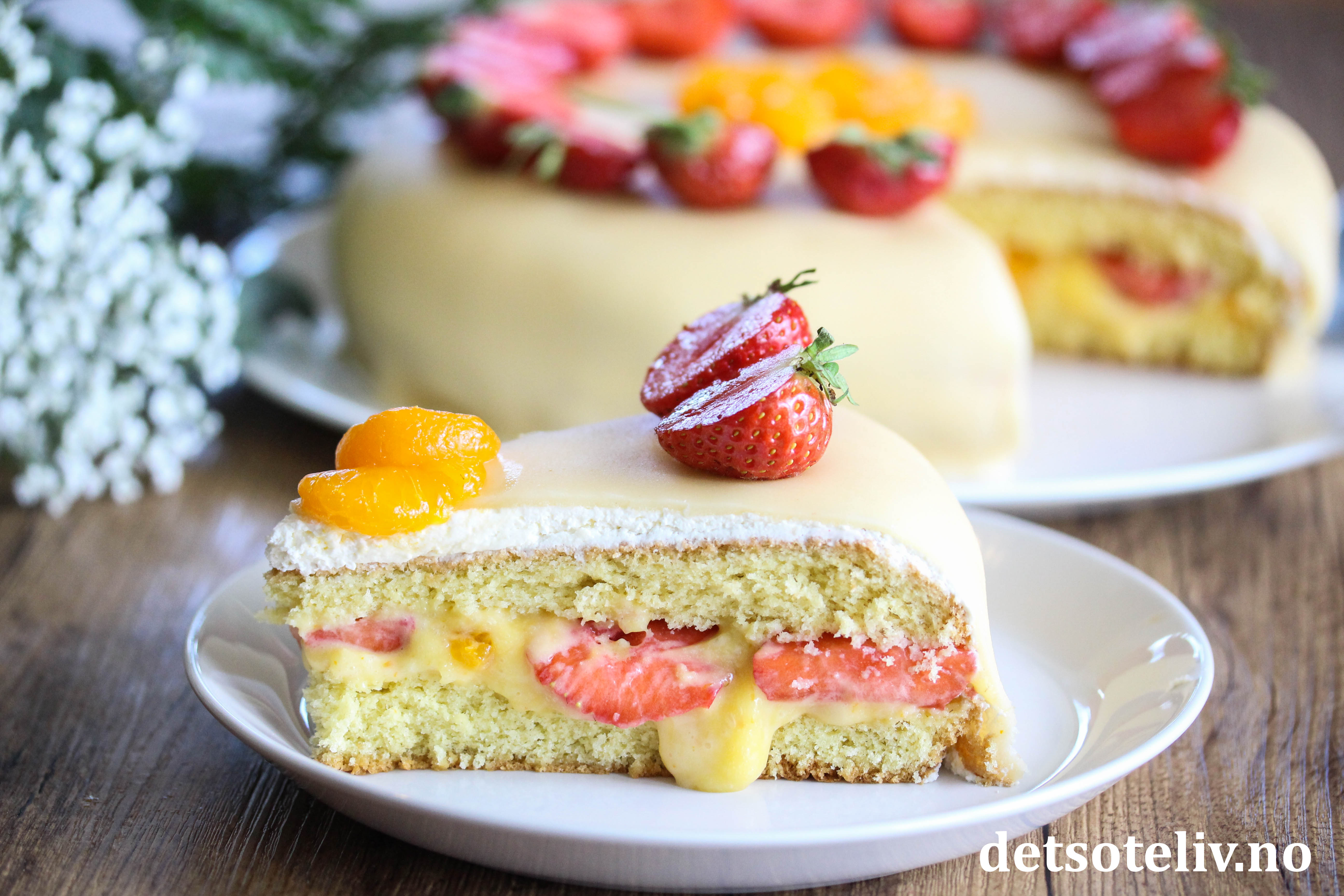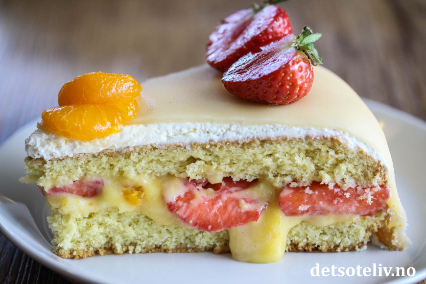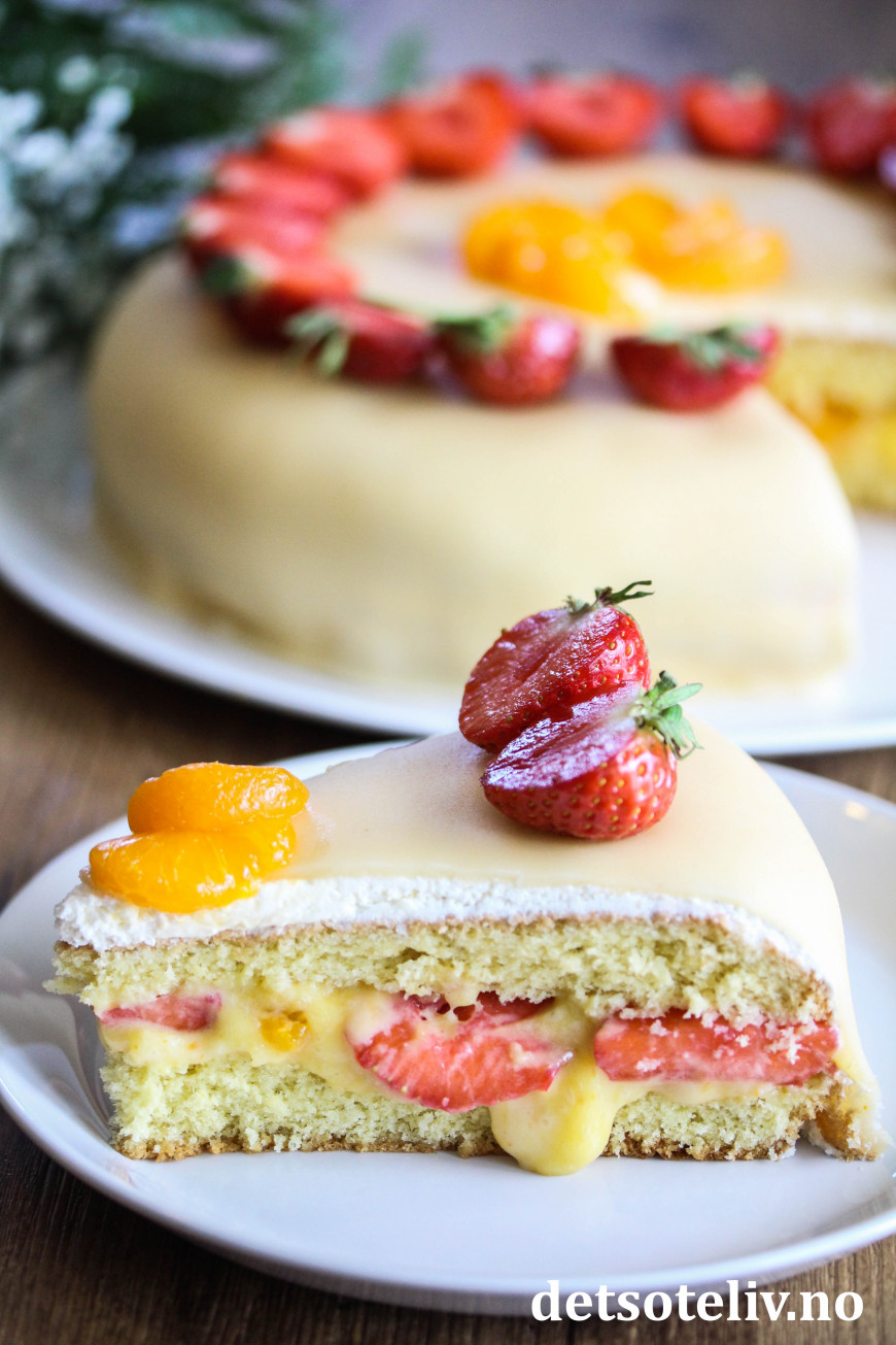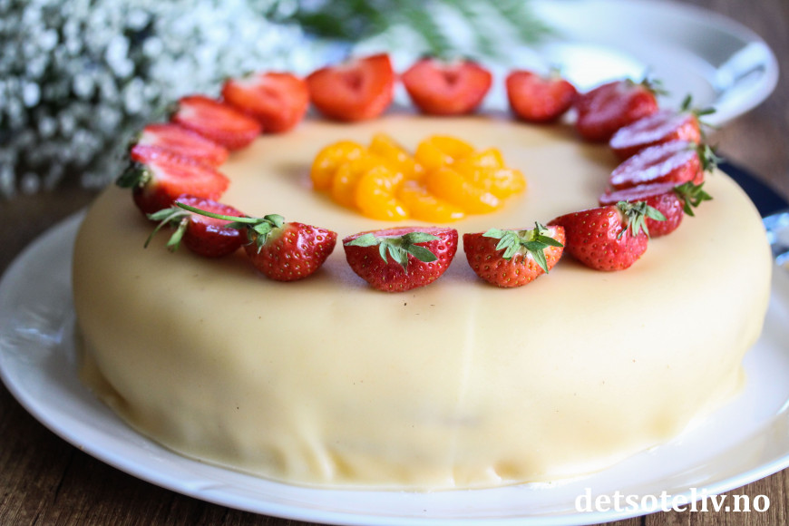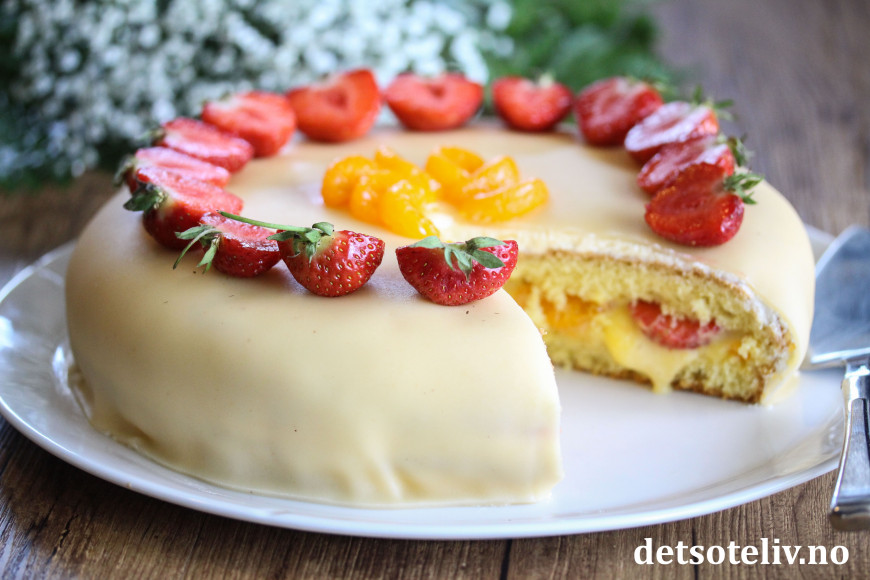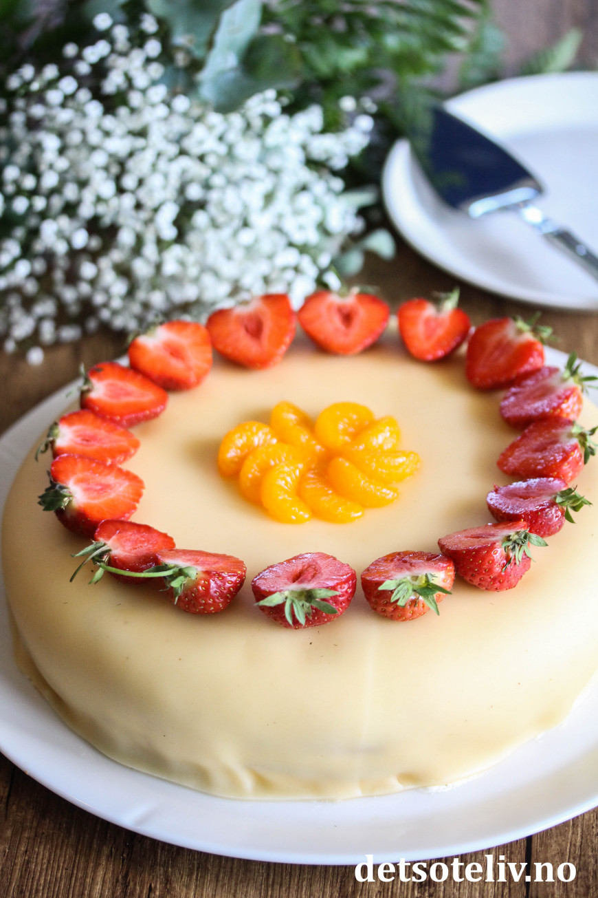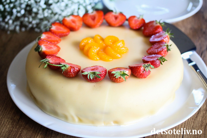 Pynt kaken med jordbær og mandarinbåter.