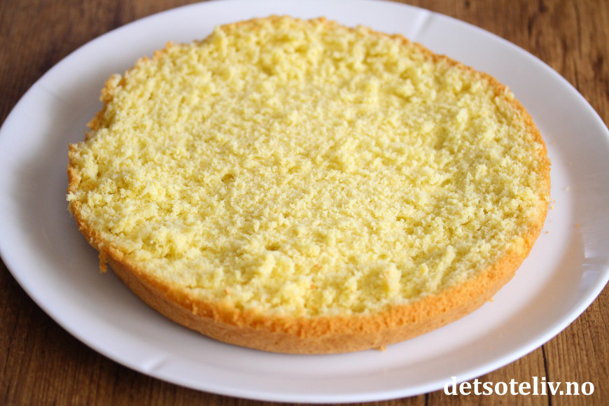 Ha deigen i rund form (24 cm i diameter) med bakepapir i bunnen. Stek kaken på rist midt i ovnen ved 175°C i ca 30 min (sjekk med kakenål at kaken er gjennomstekt i midten). Avkjøl kaken helt i formen.