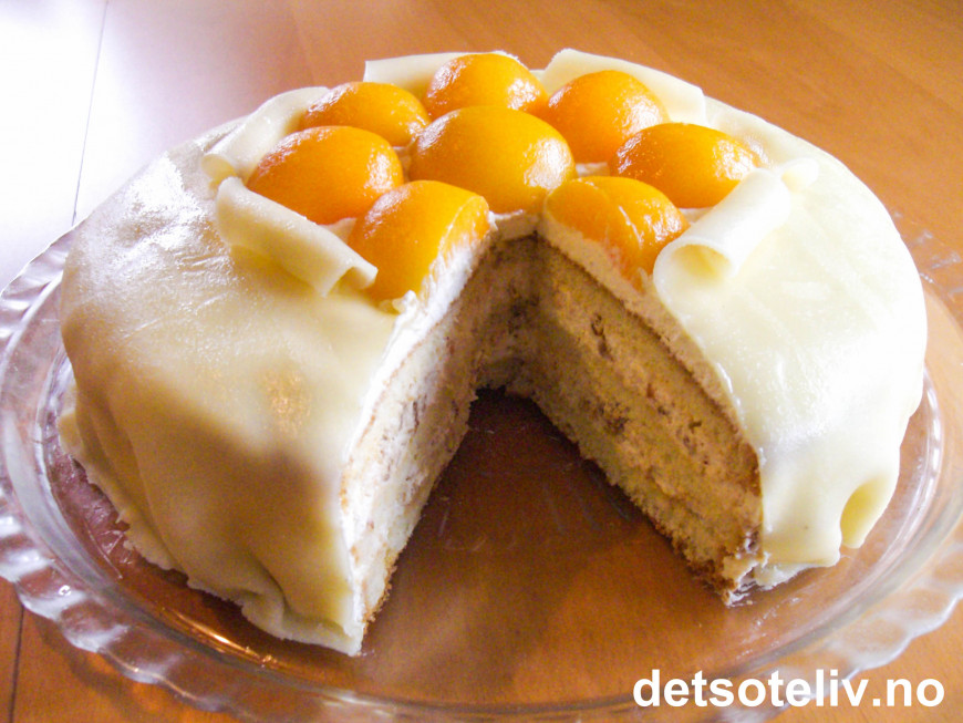 Pisk kremfløten til pynten og dekk hele kaken med denne. Klipp ut en sirkel av bakepapir og legg oppå kaken. Dekk kaken deretter med marsipanlokk. Bruk en skarp kniv og skjær opp marsipanene på toppen av kaken i smale spisser. Begynn i midten av kaken og skjær spisser til ca 3 cm fra kanten av kaken. Rull spissenen fra innsiden og utover (se bildet). Når du har laget ruller langs hele sirkelen på toppen av kaken kan bakepapiret fjernes. Fyll "hullet" på toppen av kaken med godt avrente, hermetiske aprikoser.