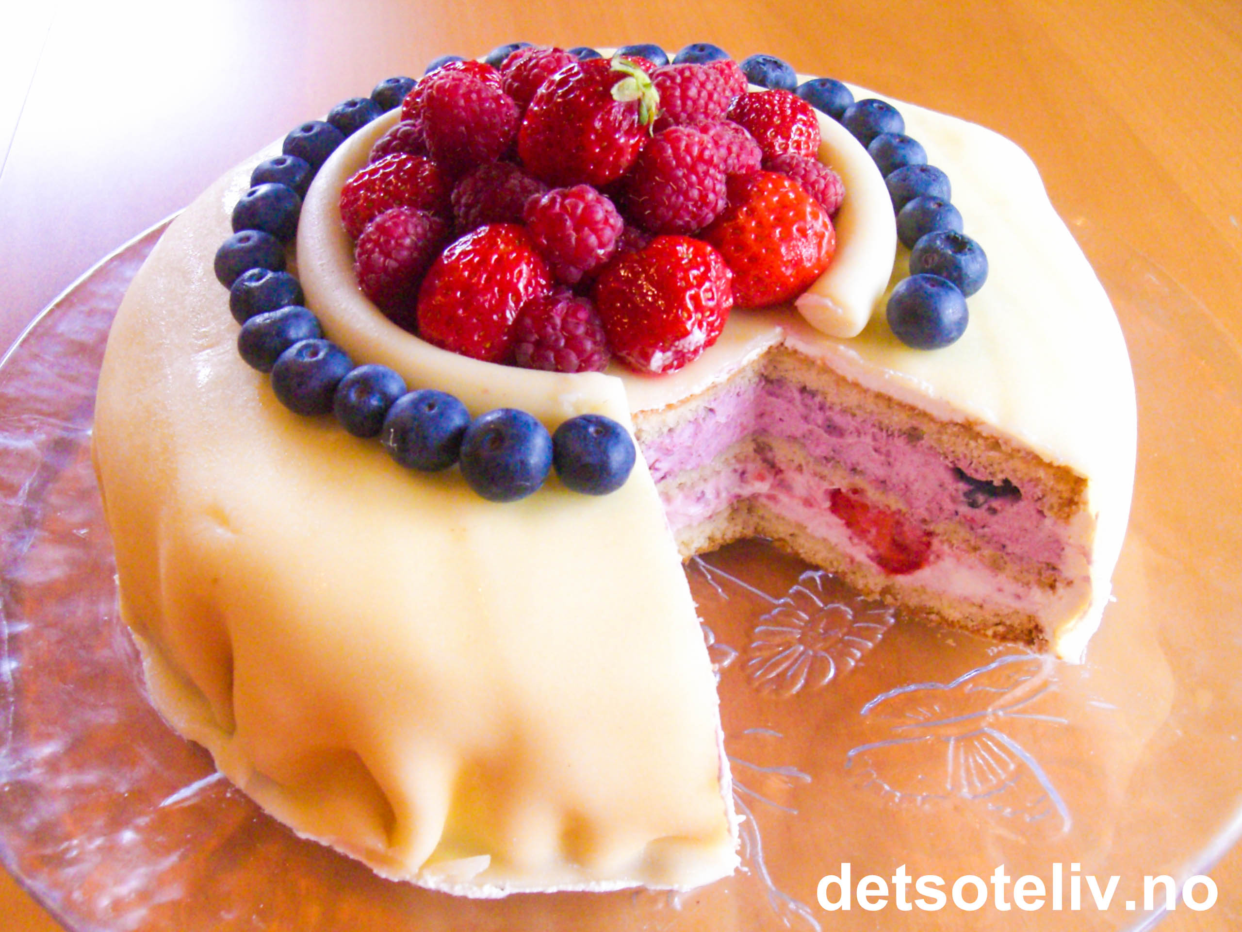 Pisk resten av kremfløten til krem og smør som et tynt lag over hele kaken. Dekk med marsipanlokk. Dersom du vil pynte kaken som på bildet; trill ut en tynn pølse av marsipan og legg som en kant i en indre sirkel midt på kaken. Pynt med bær inni og rundt sirkelen.