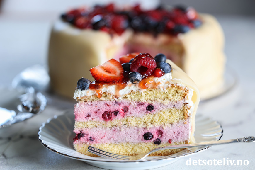 Bruk friske bær (jordbær, bringebær, blåbær, bjørnebær og/eller rips). Frosne bær gir rennende kake.