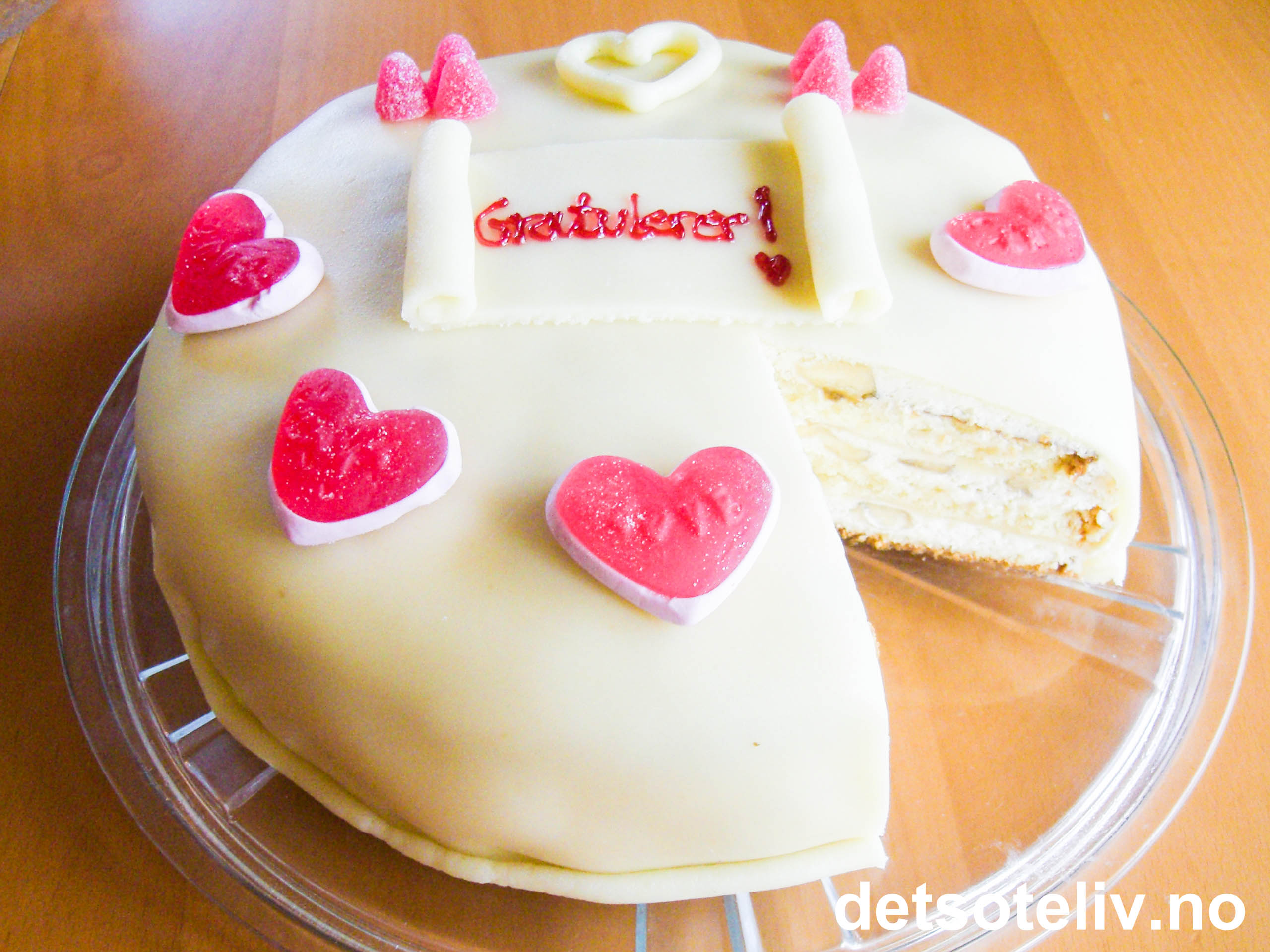 Marsipankaken på bildet er pyntet med røde gelé- og skumhjerter ("Sweethearts") og røde gelétopper. Marsipanpynten lager du ved å kjevle ut en passende stor firkant. Renskjær kantene og rull firkanten inn mot midten fra hver av sidene. Legg på midten av kaken og skriv på ønsket tekst med géleskrift.