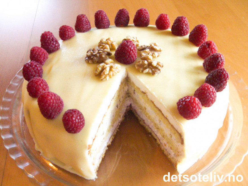Kjempegod kake, valnøtter og bringebær passet veldig fint sammen!