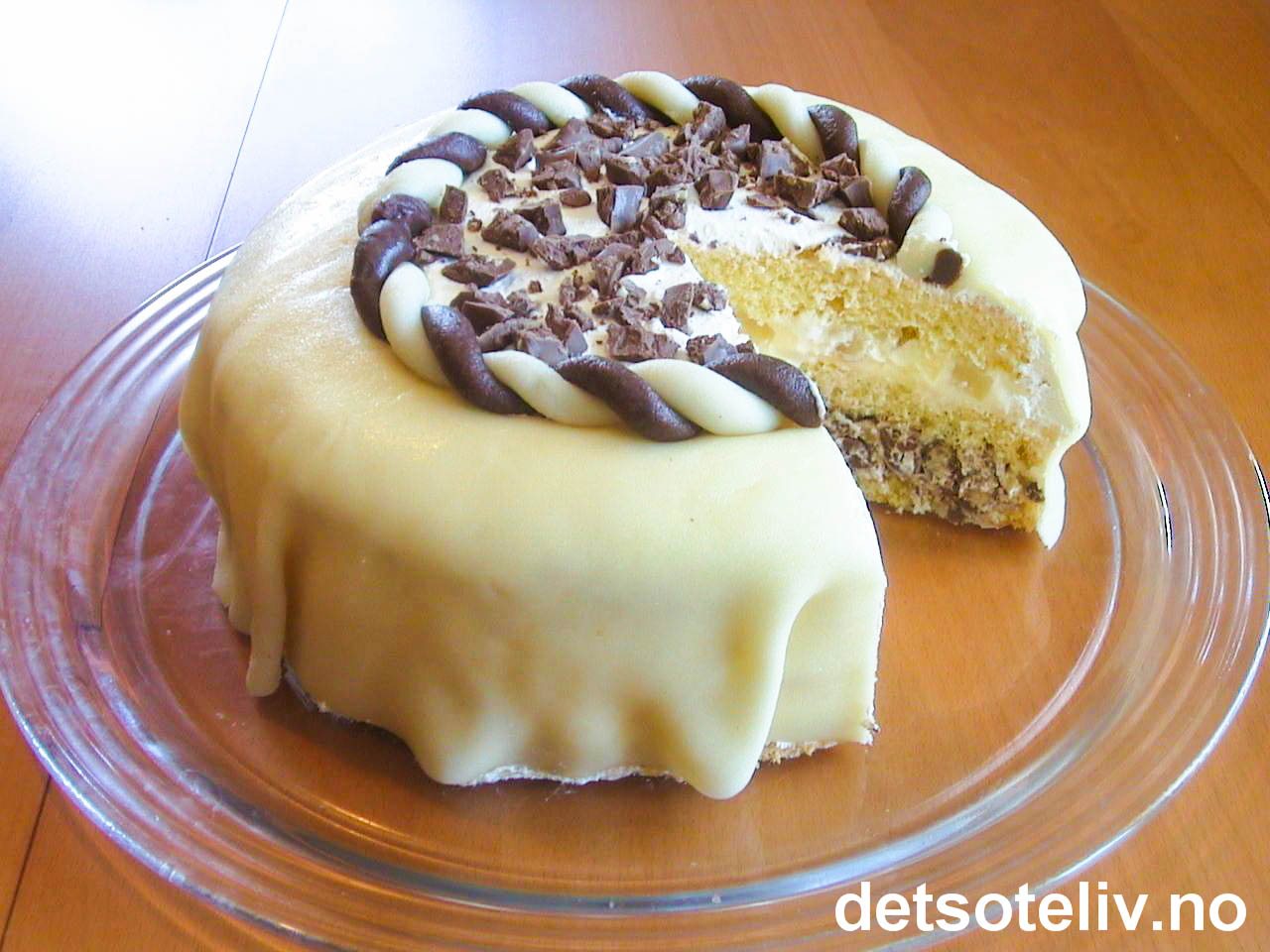 Marsipanpynten på bildet er gjort på følgende måte: Klipp ut en sirkel av matpapir, ca 22-24 cm i diameter. Legg papirsirkelen på toppen av kaken etter at du har dekket den med pisket krem. Ha så over marsipanlokket. Bruk en skarp kniv og skjær rundt papirsirkelen på toppen av kaken. Fjern marsipanen og papirsirkelen forsiktig, slik at du får et "hull" i marsipanlokket. Del marsipanen fra toppen i to deler og kna kakao i den ene delen. Rull marsipanen til en mørk og en hvit lengde som deretter tvinnes sammen. Legg dette som en pyntekant rundt sirkelen på toppen av kaken. Fyll "hullet" på kaken med hakket Cuba-sjokolade.