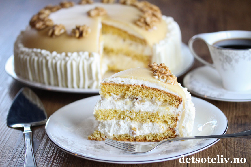 Hell deigen i en rund kakeform (24 cm i diameter) med bakepapir i bunnen. Stek kaken midt i ovnen ved 175°C i ca 40 min. Avkjøl kaken helt i formen. Ta den ut av formen og fjern bakepapiret. Del kaken i 3 bunner.