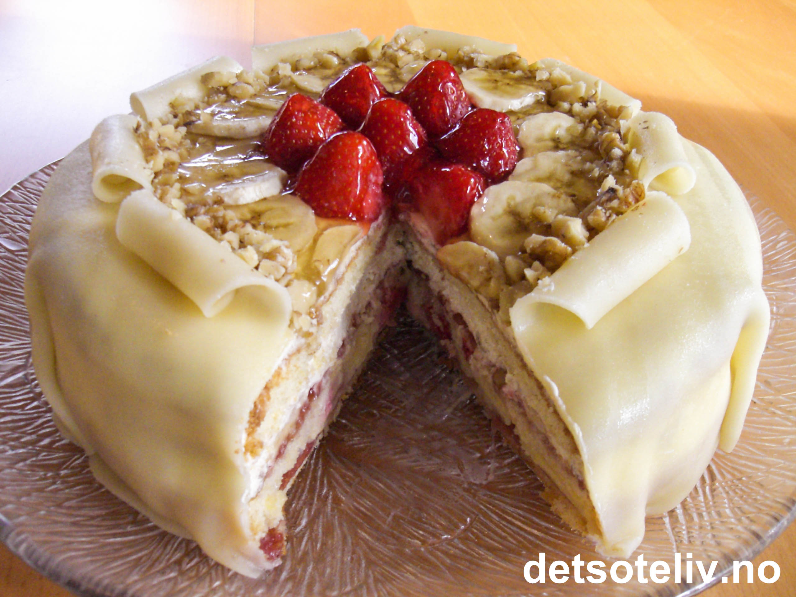 Dekk hele kaken med resten av kremen. Pynt kaken med marsipanlokk (se tips), jordbær, bananskiver og hakkede valnøtter (se bildet). Smelt eplegelé og øs forsiktig over jordbærene, bananskivene og valnøttene (se tips). Sett kaken i kjøleskapet i minst 1 time før servering.
