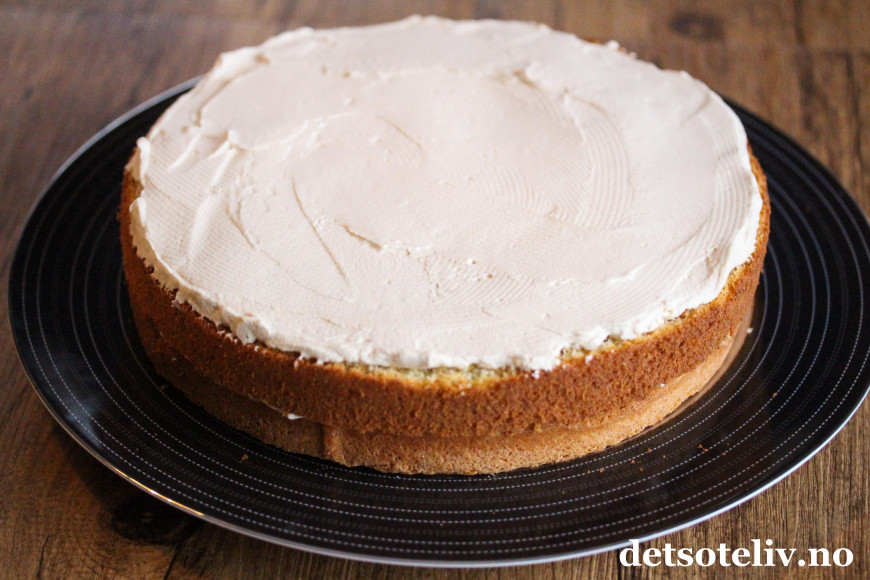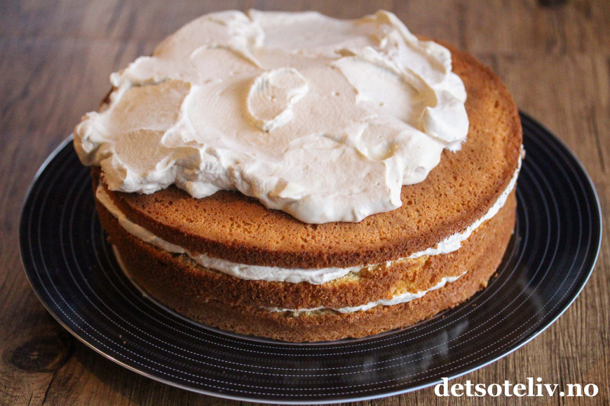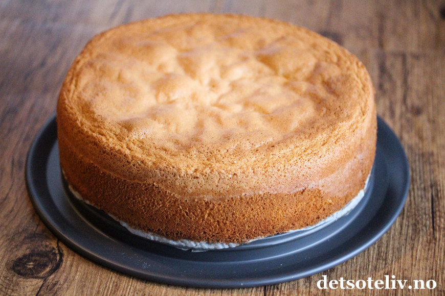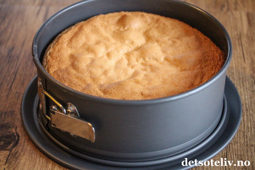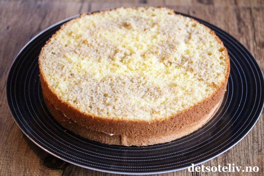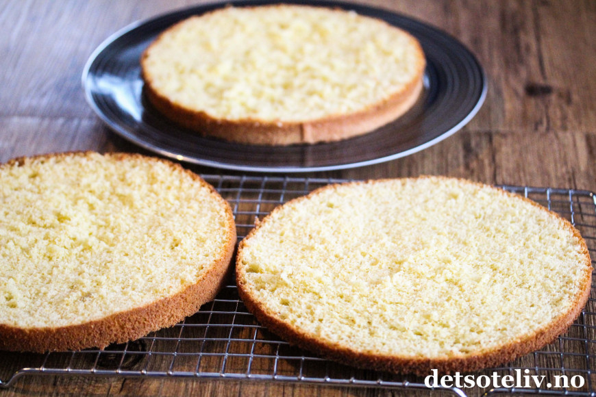 Ha deigen i en rund kakeform (24 cm i diameter) med bakepapir i bunnen. Stek kaken på rist midt i ovnen ved 175°C i ca 30-35 minutter (sjekk med kakenål at kaken er gjennomstekt i midten). Avkjøl kaken helt i formen. Løsne kaken fra formen med en skarp kniv. Ta kaken ut av formen og fjern bakepapiret. Del kaken i tre bunner.