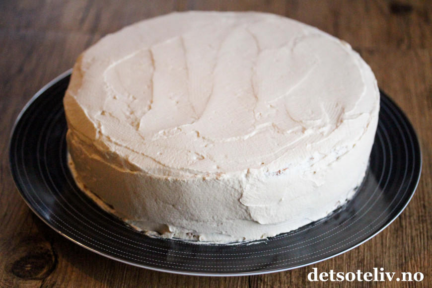 Fyll kaken med kaffekrem og smør resten over hele kaken.