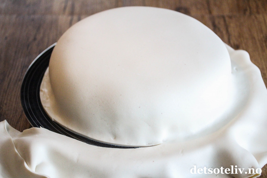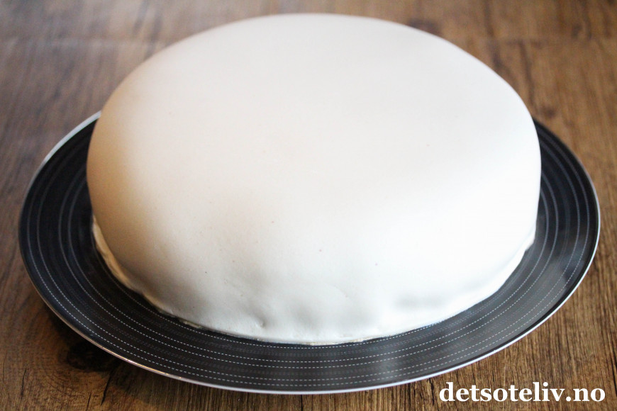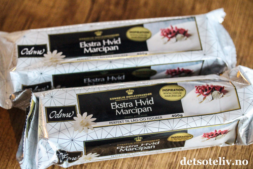 ♥ Hvit marsipan fra Odense gjør kaken ekstra fin og fås kjøpt i de fleste norske matbutikkene. Jeg bruker to pakker for å være sikker på at det blir nok, men får da en god del marsipan til overs.