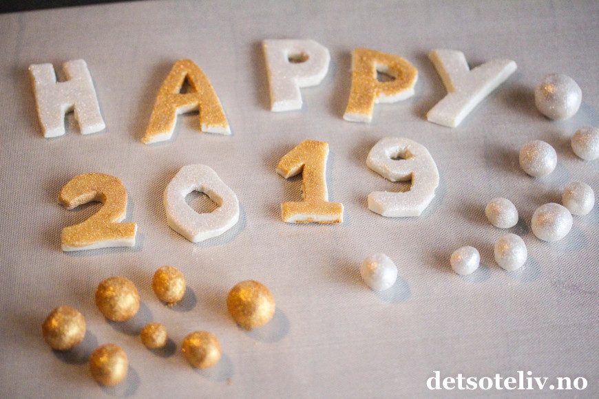 Vil du pynte kaken som jeg har gjort her, kan du skjære ut bokstaver og trille kuler av marsipan og pynte dette med glitrende kakestøv i sølv og gull (se tips).
