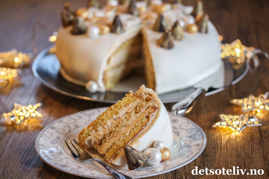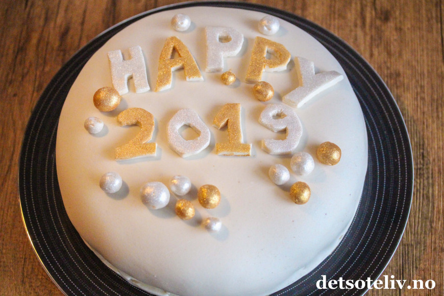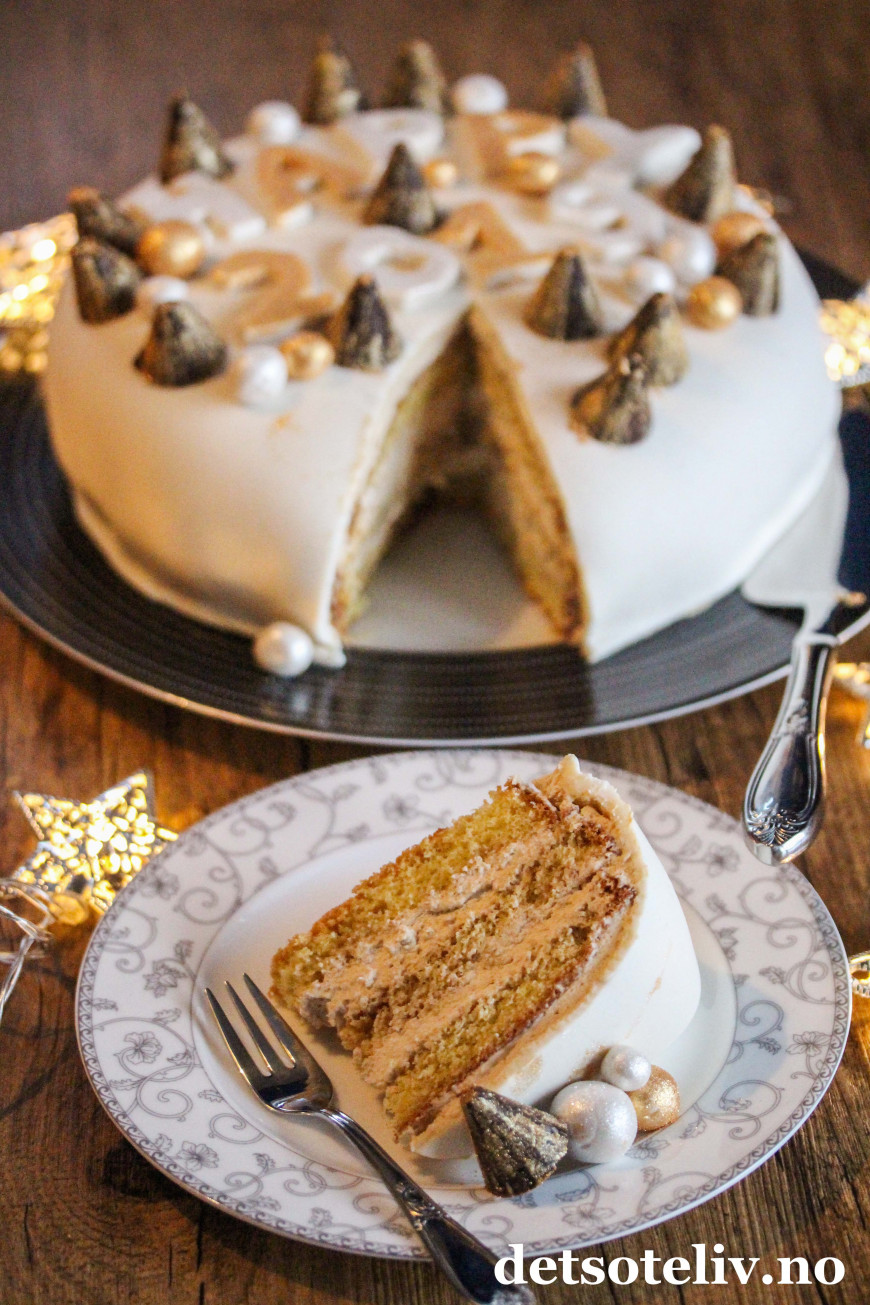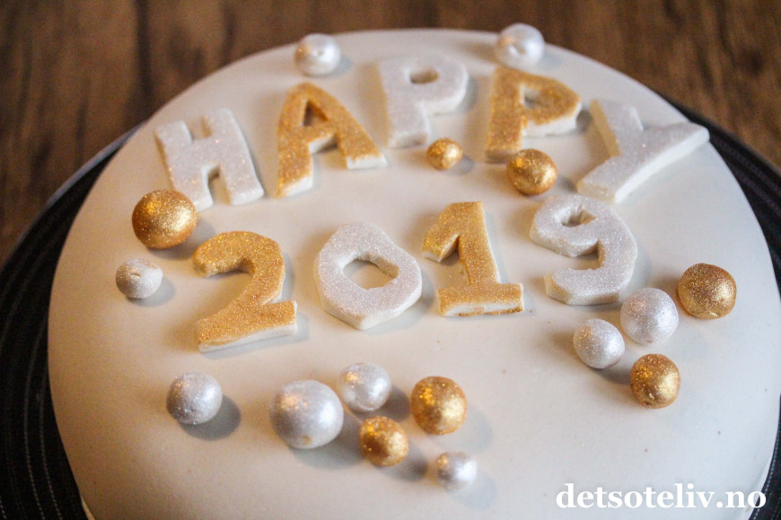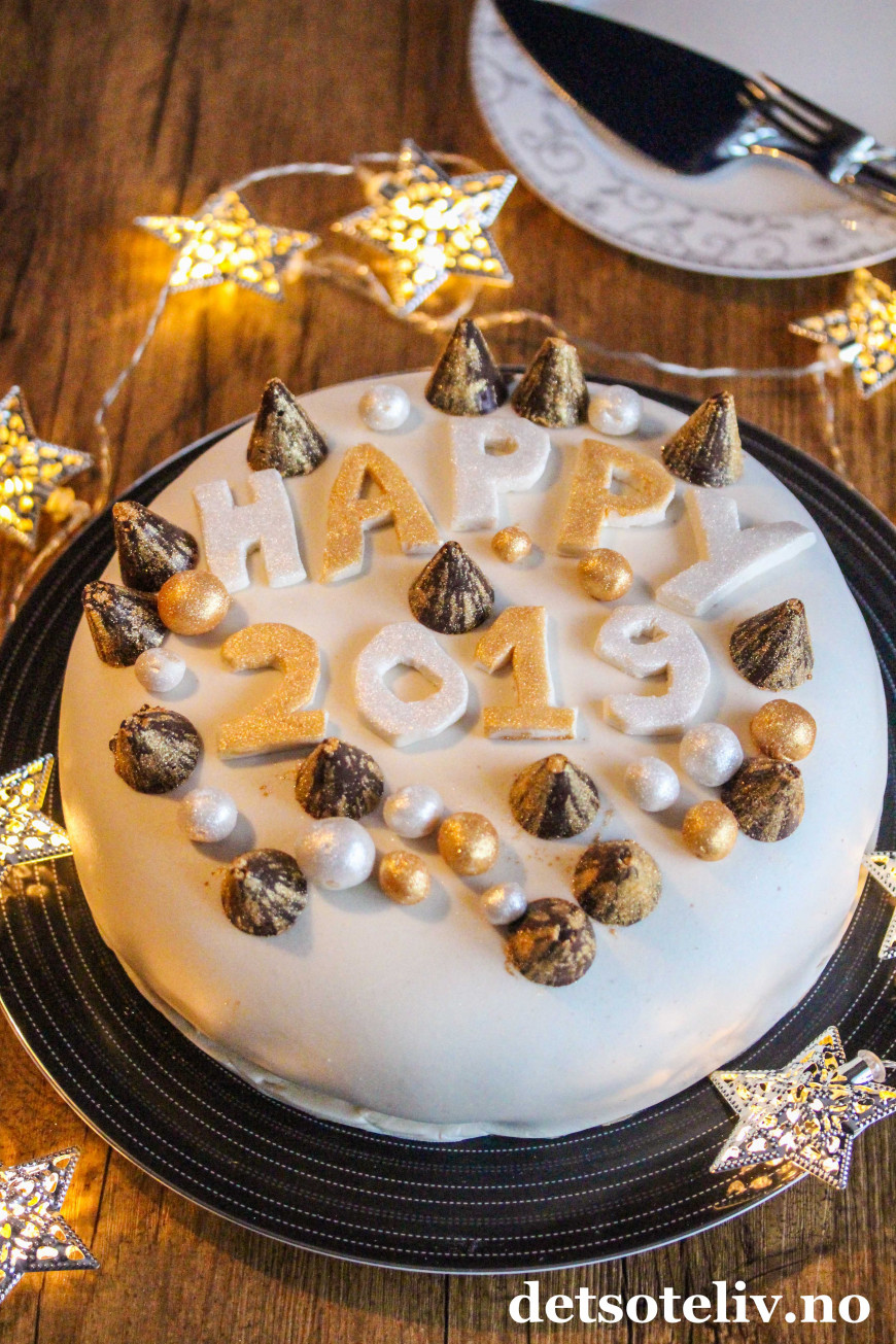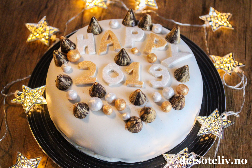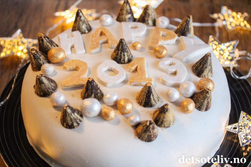Nå har jeg pyntet denne deilige kaken til nyttårsfest med hvitt marsipanlokk, hjemmelaget kaffekonfekt og glitter i sølv og gull!