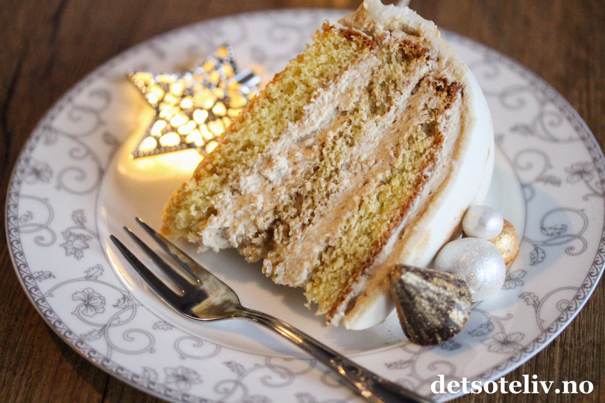 Luftig fløtekrem med kaffesmak er det eneste fyllet i denne marsipankaken.