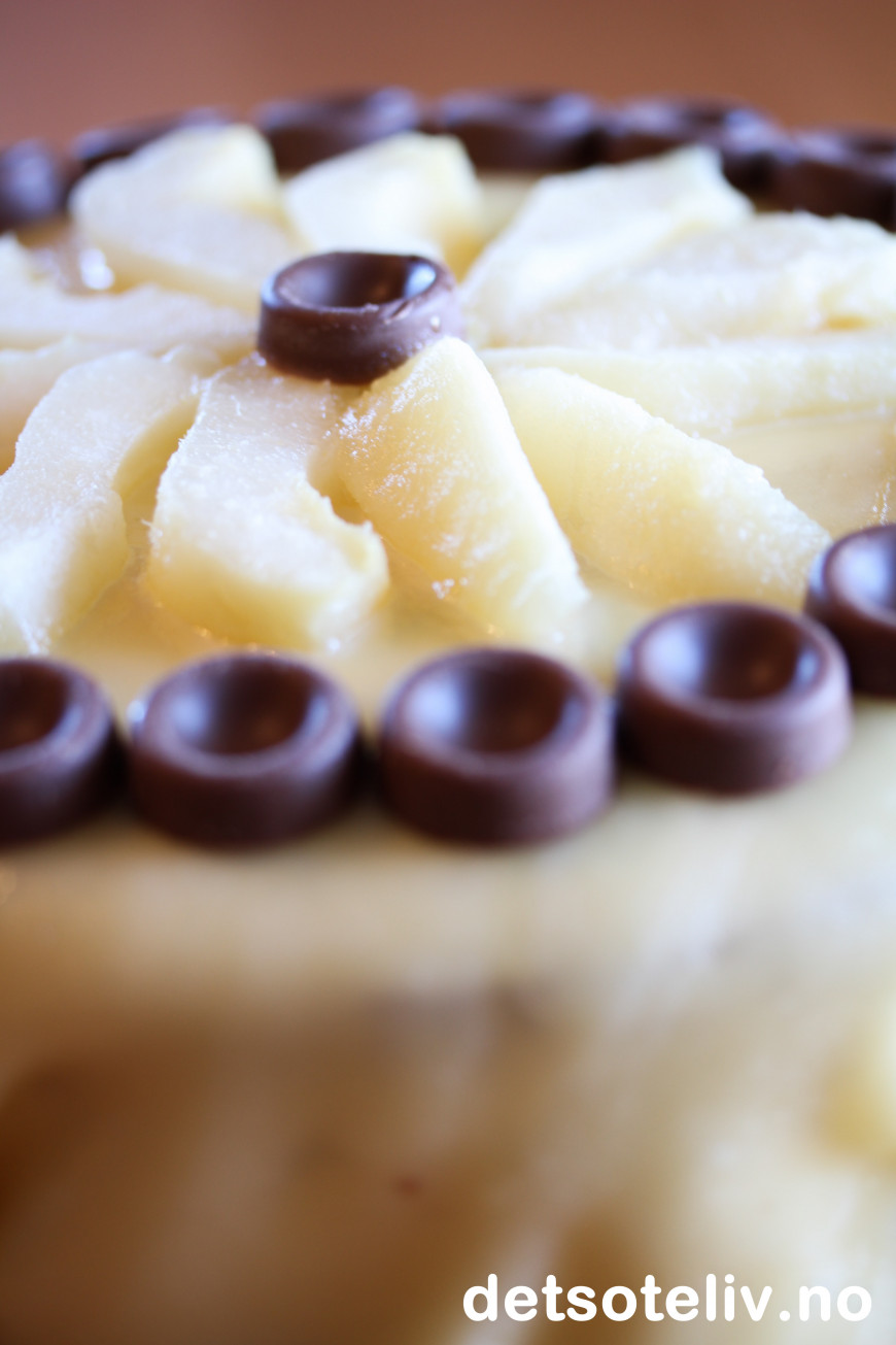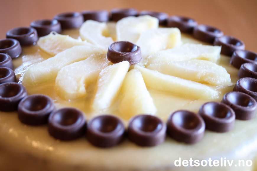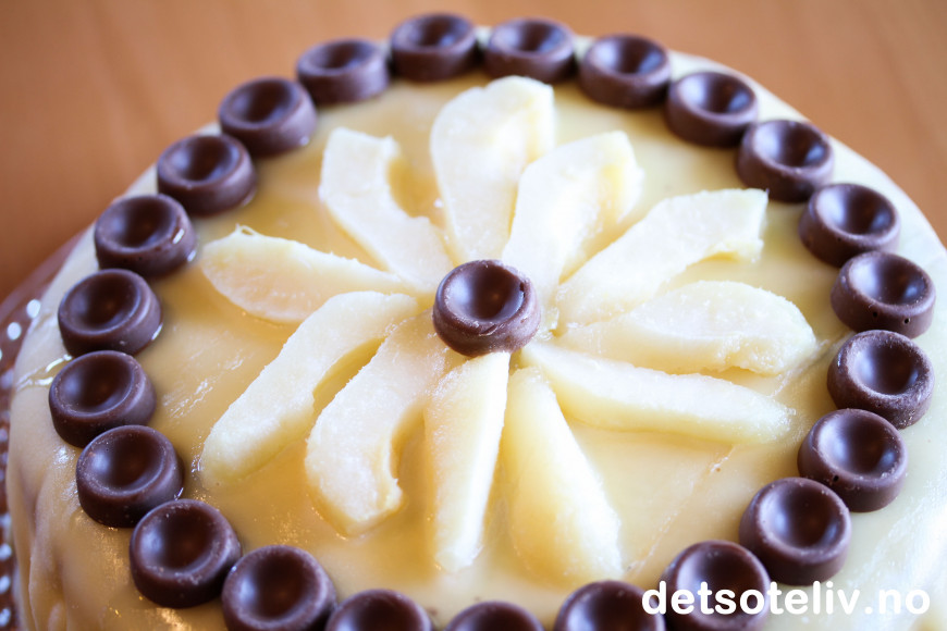 Pynt med marsipanlokk, pæreskiver og hele biter med krokanrull - eventuelt i kombinasjon med noen hvite kremdotter eller hvite sukkerblomster.