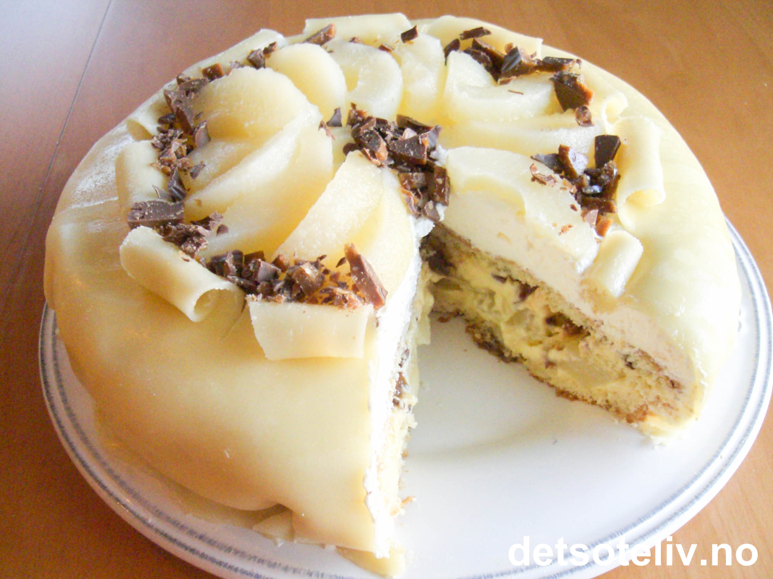 Pisk kremfløten til krem. Fordel kremen jevnt over hele kaken. Klipp ut en liten sirkel av bakepapir og legg oppå kaken. Dekk kaken med marsipanlokk. Skjær så snipper i marsipanlokket fra midtpunktet på toppen av kaken og ut til ca 2 cm fra kanten. Rull snippene utover mot kanten, slik at du åpner opp hullet i midten av marsipanlokket (se bildet). Fjern papiret og pynt hullet oppå kaken med pæreskiver og fint hakket Daim.