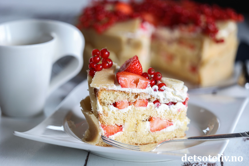 Den ferdigpyntede kaken bør ikke stå for lenge før den serveres, for bananskivene på toppen av kaken vil bli litt brune etter hvert. Gi kaken eventuelt et melisdryss - det ser lekkert ut!
