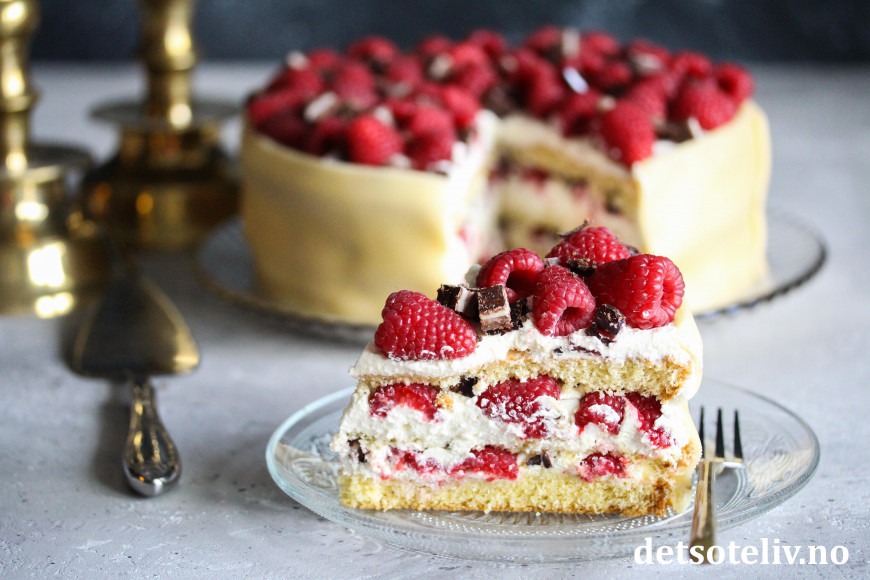 Ha den nederste kakebunnen på et fat. Dekk med et lag krem og fordel over 1/3 av bringebærene og Troika sjokoladen. Gjenta med det andre kakelaget. Bre resten av kremen over toppen av kaken og litt langsmed sidene.