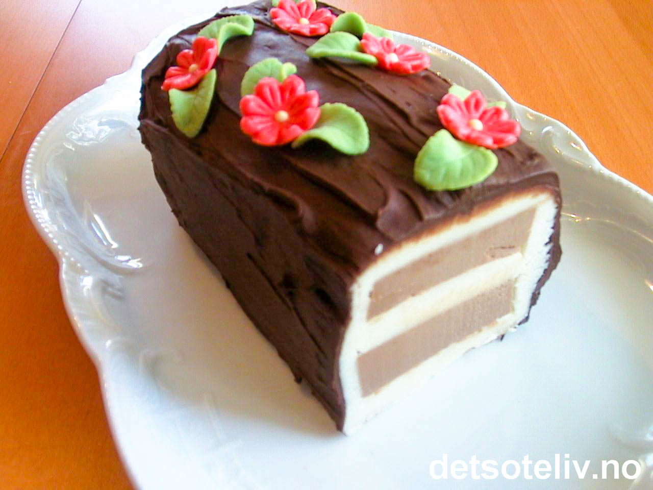 Smør sjokoladeglasuren jevnt over hele kaken (bruk en smørekniv). Pynt kaken etter ønske. Settes i kjøleskapet til sjokoladen har stivnet.