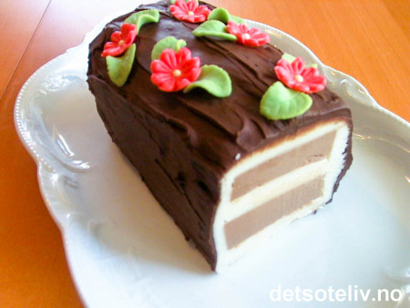 Del nougaten i to på midten, slik at du får fire, flate firkanter. Kjevle ut marsipanen til en tykk leiv (litt tynnere enn nougatskivene). Legg to nougatblokker etter hverandre på marsipanen og skjær rundt med en skarp kniv. Gjør det samme med de andre to nougatblokkene og legg disse oppå. Du har dermed en kubbe med to lag marsipan og to lag nougat. Skjær ut resten av marsipanen til å dekke toppen og sidene av kubben. Sett den marsipankledde kubben på et brett e.l. som er dekket med et stykke matpapir.