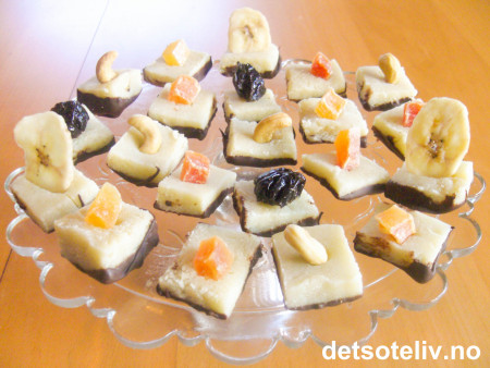 Legg konfekten med sjokoladesiden ned på et lite fat. Pynt marsipanen med nøtter og tørket frukt.
