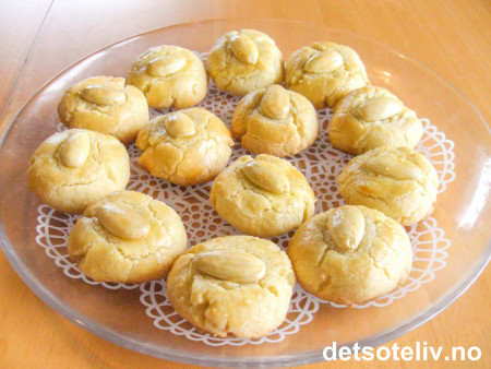 Form deigen til 60 kuler. Legg dem på bakepapirdekkede stekeplater. Trykk ned en skålded mandel i hver kake. Rør sammen eggeplommen og litt vann og pensle over kakene til slutt.