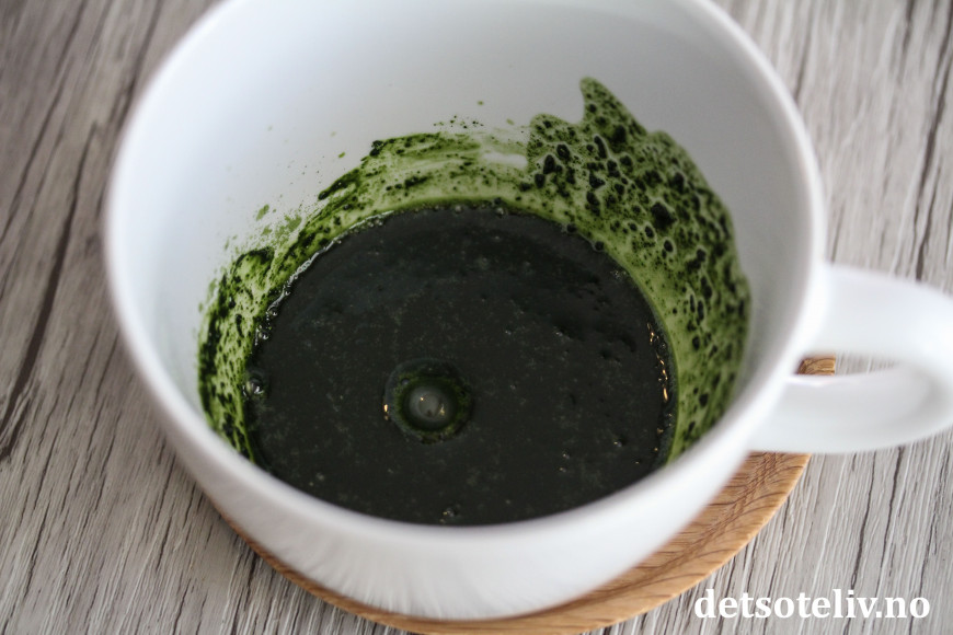 Tilsett kokende vann og rør godt sammen slik at matchapulveret løser seg opp.