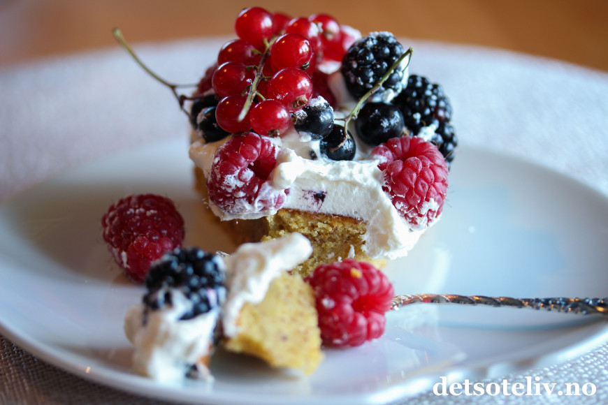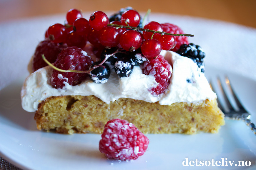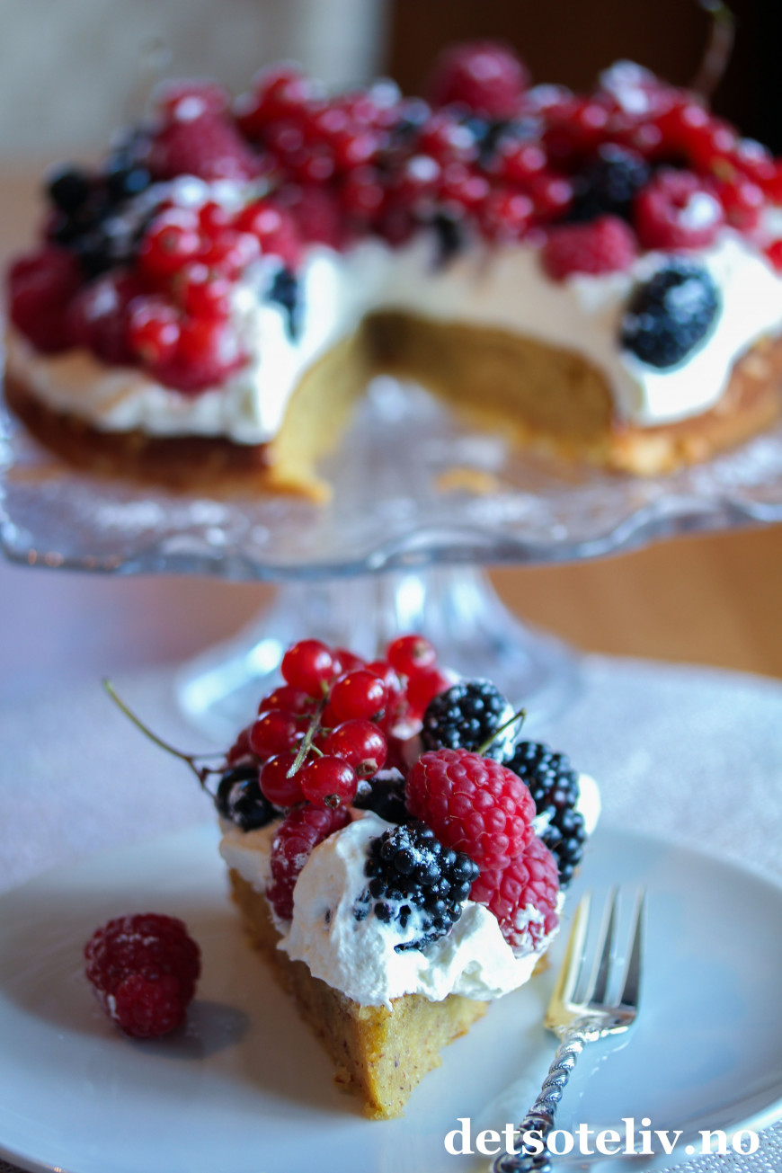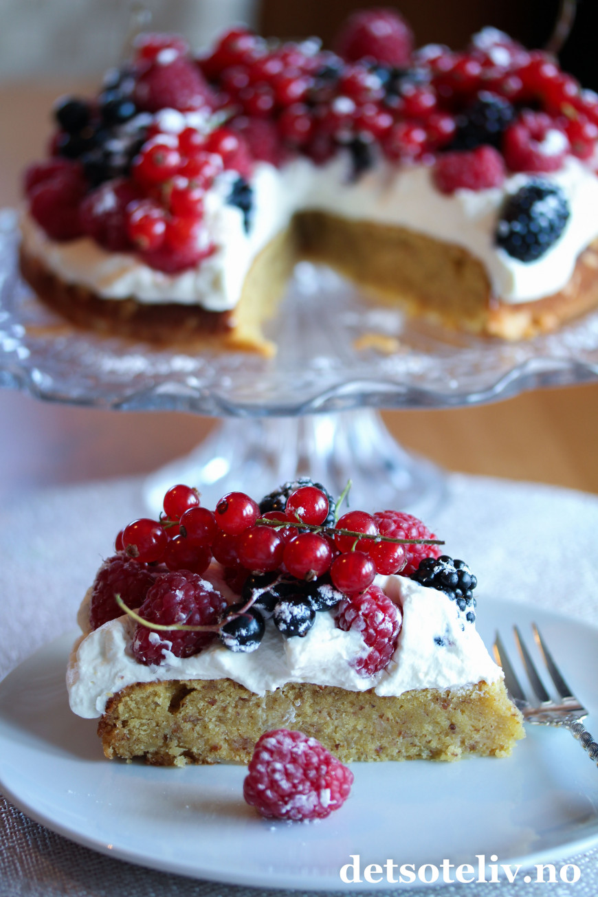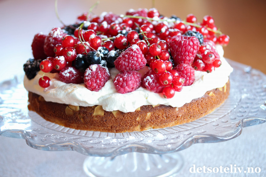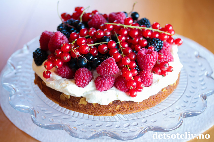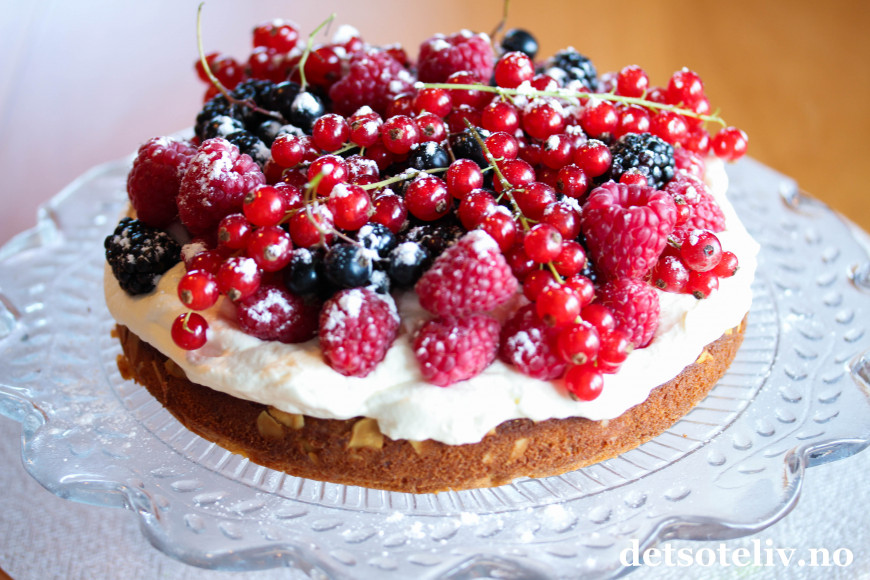 ♥ Kaken kan fint lages dagen i forveien, men bør pyntes med krem og bær på serveringsdagen slik at den ser helt fersk ut.