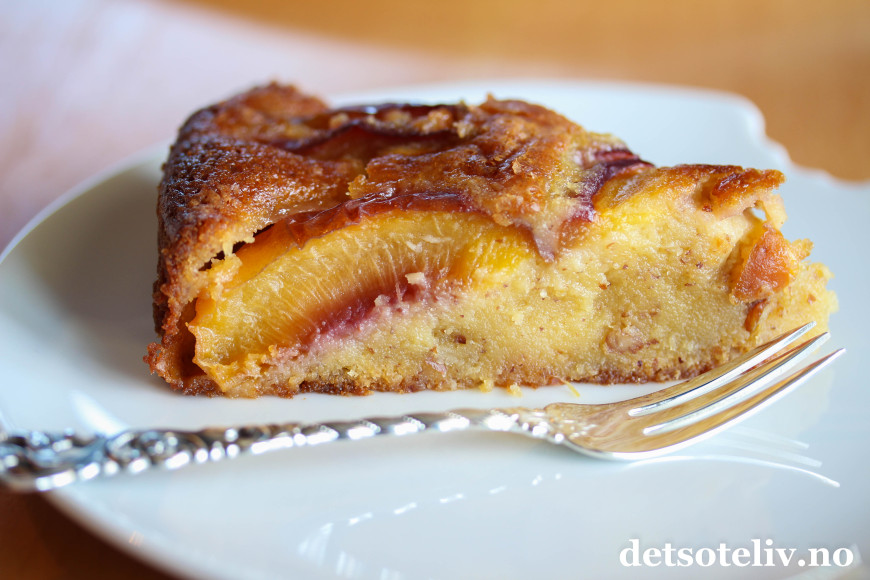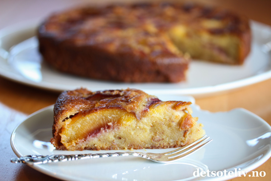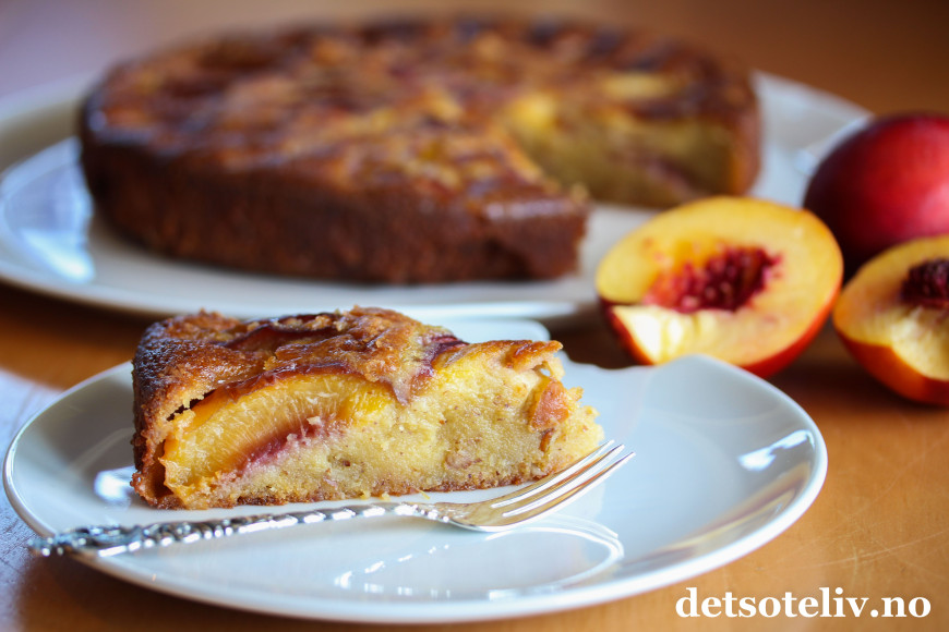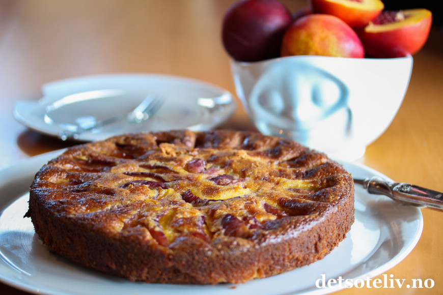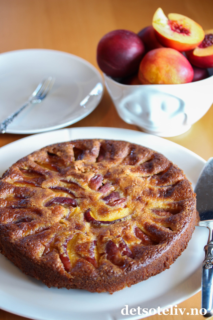 Her har du en super "Mazarinkake med nektariner" som får utrolig god mandelsmak av både revet kransekakemasse, hakkede mandler og mandellikør.