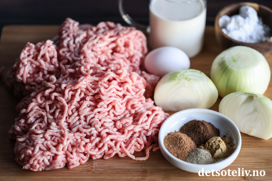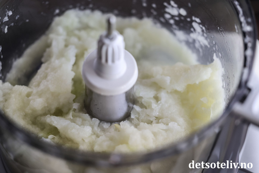 ♥ Jeg river løken for å få den helt most. Løken blander seg da helt med medisterdeigen og du får ikke små løkbiter i medisterkakene, som du vil få dersom du finhakker løken i stedet. Jeg bruker rivjernet på min food processor for å unngå at det skal svi i øynene, men du kan også bruke vanlig rivjern.