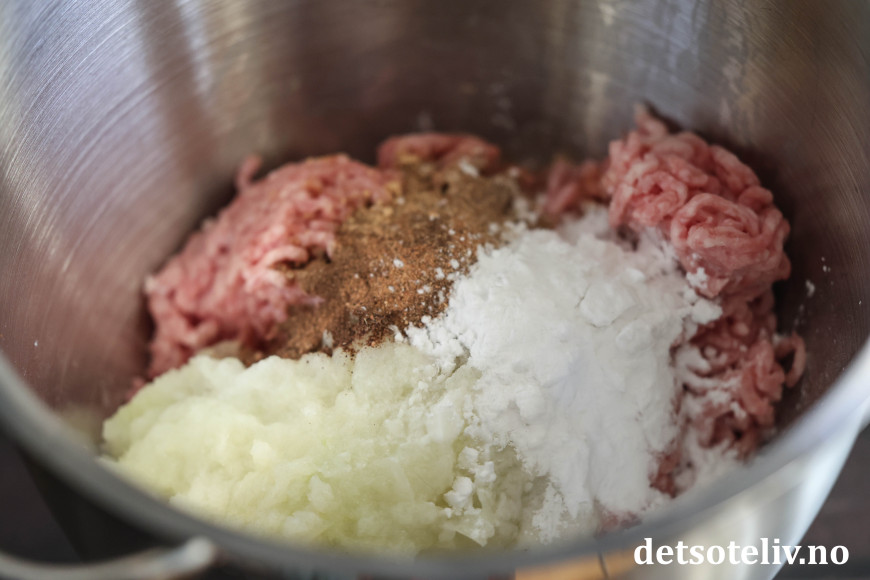 Ha revet løk, potetmel, krydder og egget i bollen med medisterdeigen.