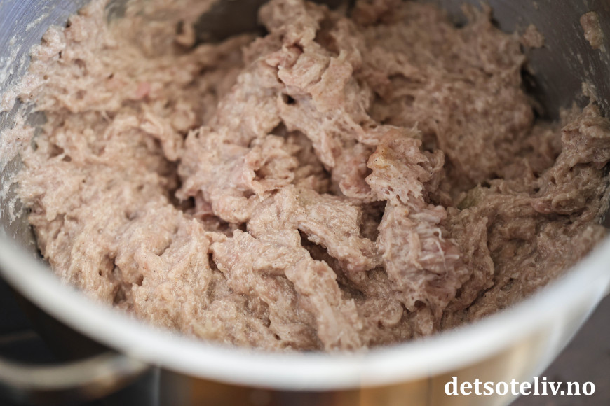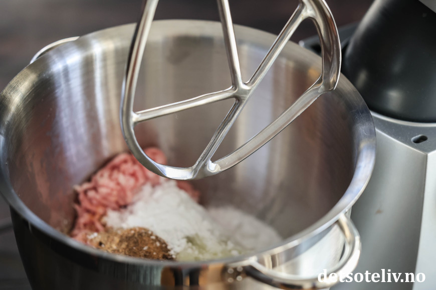 ♥ Det er en fordel å ha kjøkkenmaskin med K-spade når du skal elte kjøttet smidig, men har du ikke kjøkkenmaskin, går det greit å røre medisterdeigen sammen for hånd.