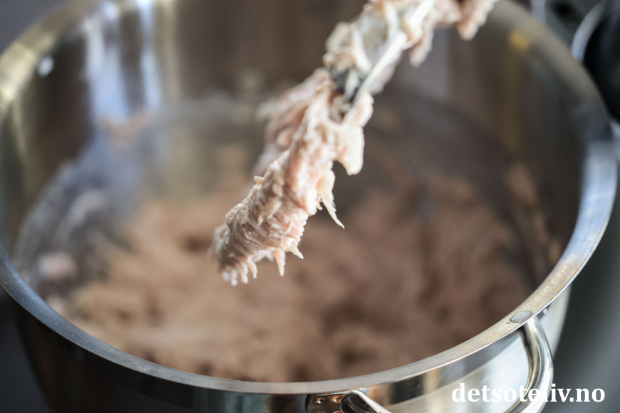 Elt dette rolig sammen i et par minutter. Spe litt og litt med melken mens kjøkkenmaskinen går på lav hastighet, helt til melken er helt inkorporert i kjøttmassen.