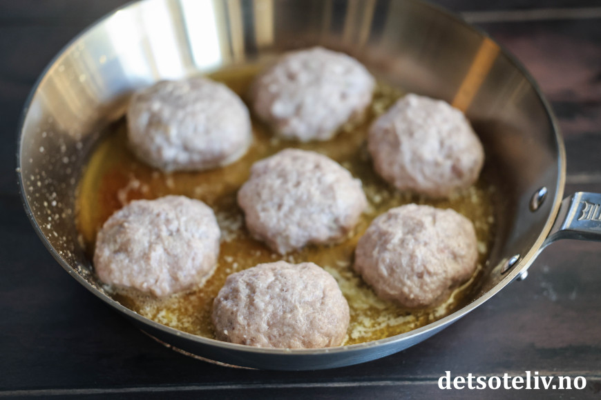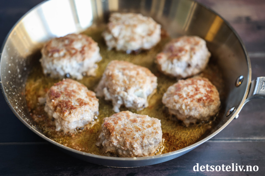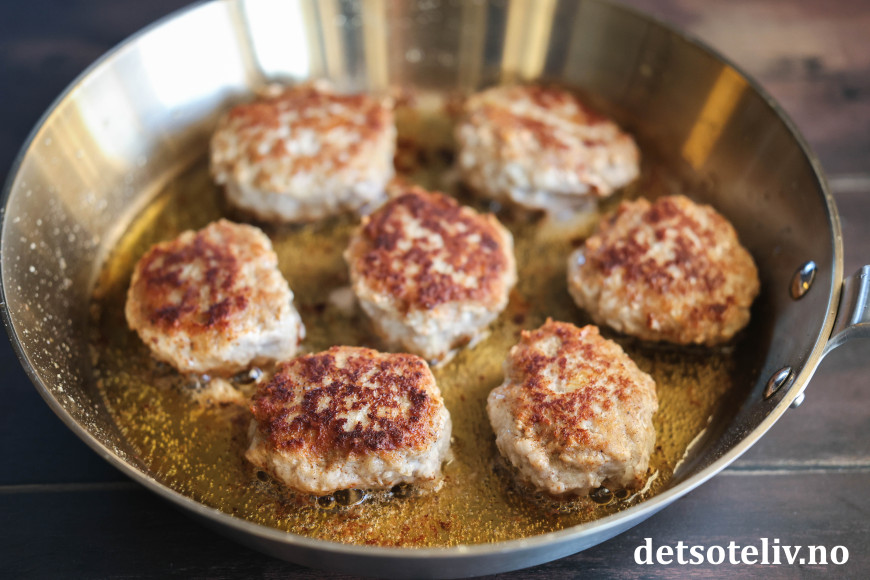 Ikke stek for mange medisterkaker om gangen, så du har god kontroll på stekingen.