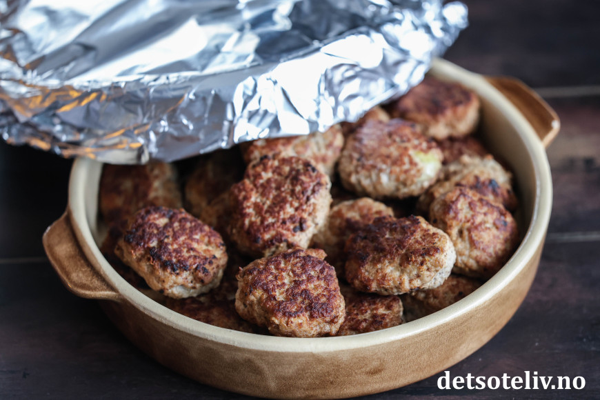Ha de stekte medisterkakene i en ildfast form. Dekk over med aluminiumsfolie og etterstek medisterkakene i stekeovnen ved 200°C i ca. 15 minutter så de blir gjennomstekte inni.