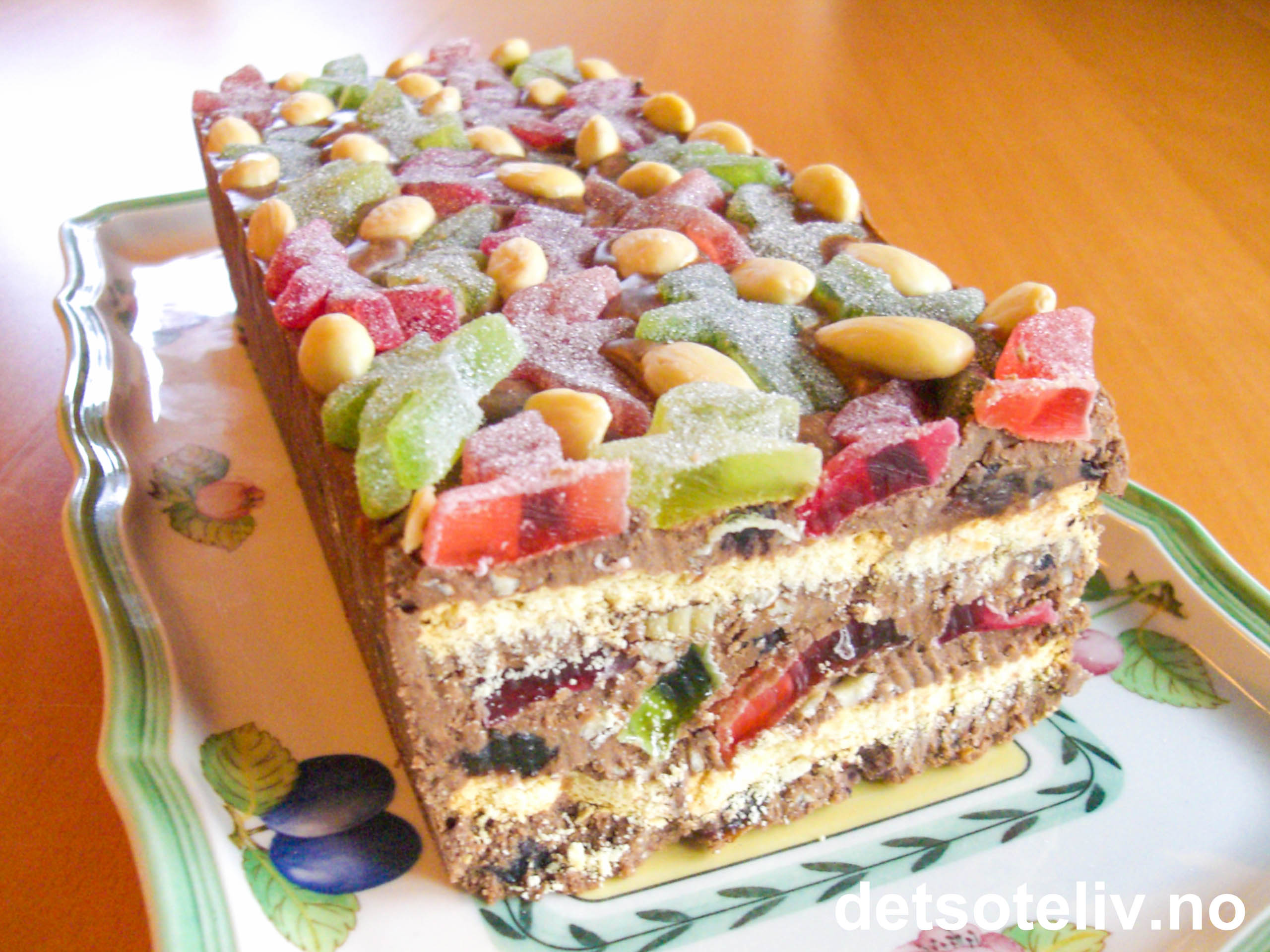 Kle en liten, smurt brødform (1 liter) med matpapir i bunn og kanter. Hell først i litt av sjokolademassen, slik at bunnen på formen blir godt dekket. Legg på et lag med Per-kjeks. Dekk over med sjokolademasse. Legg så på et tett lag med seigmenn. Hell på litt mer sjokolade og så et lag til med Per-kjeks. Ha resten av sjokoladen på toppen. Pynt med seigmenn og skåldede mandler. Sett formen i kjøleskapet til sjokoladen har stivnet (minst noen timer og gjerne over natten).