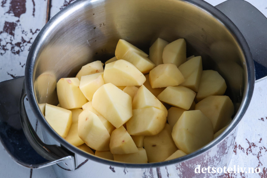 Skrell potetene og del dem opp i litt mindre biter. Ha dem i en mellomstor kjele.