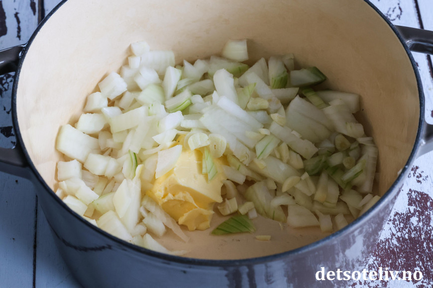 Ha smøret i en gryte. Kutt opp løk og hvitløk og ha dette i gryten.