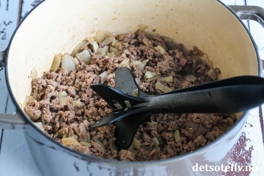 La den steke sammen med løken til den er gjennomstekt. Hakk opp karbonadedeigen mens den steker.