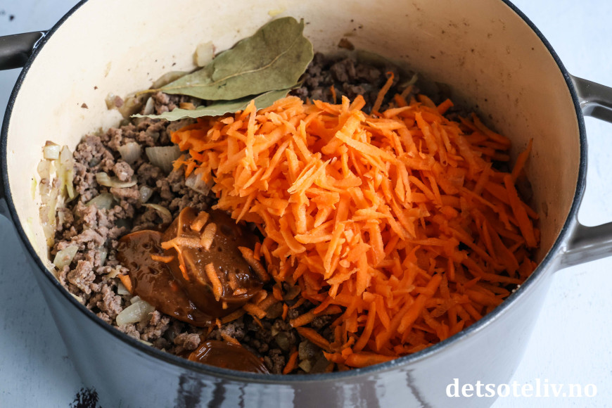 Tilsett revne gulrøtter, kjøttkraft (jeg bruker her 3 fond du chef, kjøtt til 8 dl vann), laurbærblad og worcestersaus. Kvern over salt og pepper.